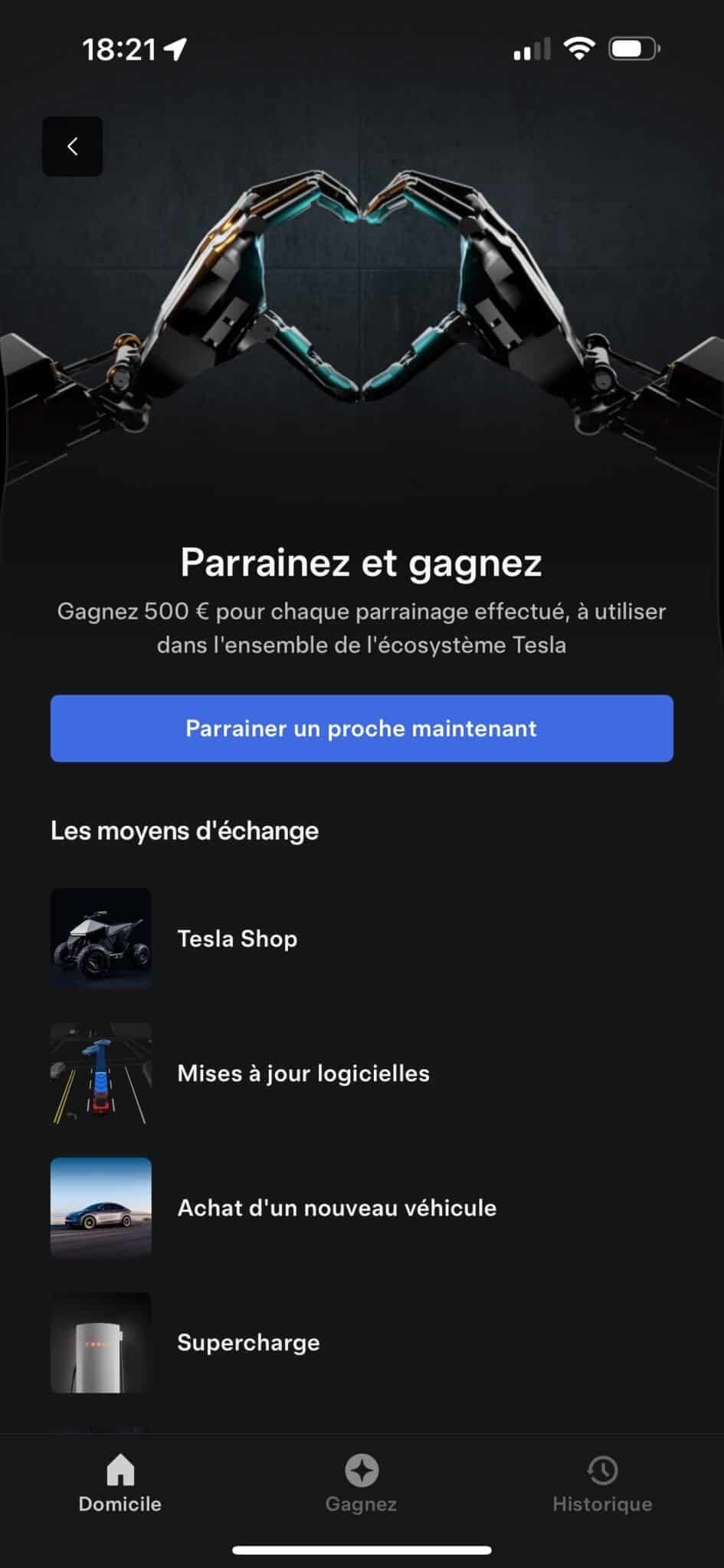 Le principe est simple : le lien de parrainage est à partager avec une personne souhaitant acquérir un véhicule chez Tesla. Ce dernier bénéficiera d’une réduction de 1 000 euros sur le véhicule de son choix. Lorsque l’achat est effectué, des avantages sont aussi débloqués pour le parrain. En effet, les propriétaires de Tesla peuvent gagner jusqu’à 500 euros en crédits à utiliser dans l’écosystème de la marque.