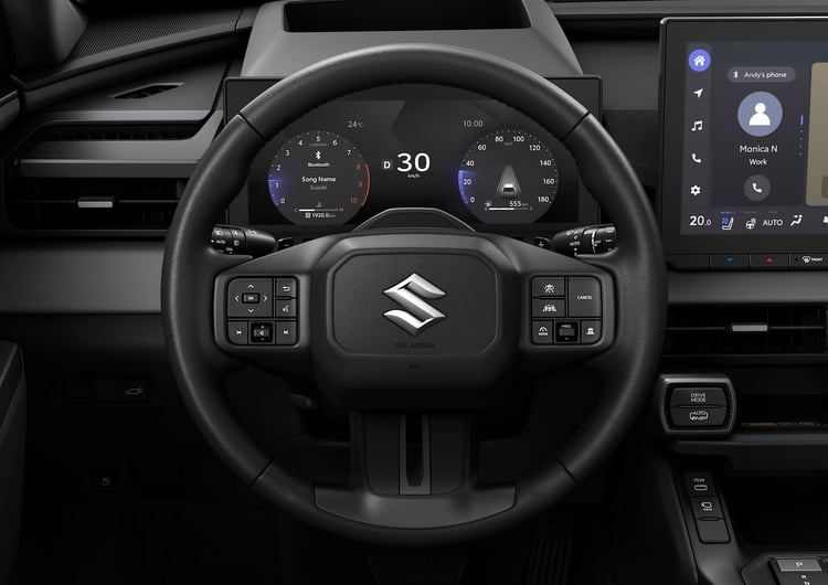La planche de bord est identique, seul le logo sur le volant est changé ! Au moins, cette Suzuki est à jour sur le plan technologique, avec un grand écran tactile de 12,9 pouces et une instrumentation numérique de 12,3 pouces. Conducteur et passager sont séparés par un large accoudoir central. Le coffre a un volume de 446 litres.