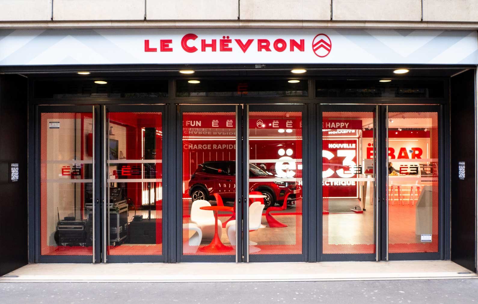 Pour marquer le lancement de la nouvelle Citroën ë-C3, la marque a ouvert pendant un mois un pop-up baptisé « Le Chëvron », dans le huitième arrondissement de Paris. Cet espace éphémère a permis aux visiteurs de découvrir la voiture et de s’informer sur ses caractéristiques techniques.