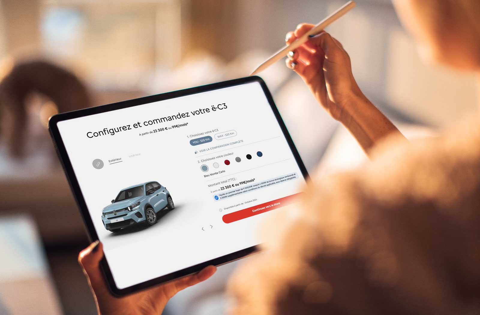 Pour faciliter l’achat de la Citroën ë-C3, le constructeur aux chevrons a repensé l’expérience client en ligne. Sur le site dédié, les utilisateurs peuvent configurer leur voiture selon leurs préférences. La plateforme interactive a été simplifiée pour offrir une grande flexibilité aux clients : choix des finitions et des couleurs, photos détaillées de l’intérieur et de l’extérieur, détail des offres de financement, options de recharge en option. En seulement quelques clics, on découvre sa future voiture électrique, dont le prix de départ s’élève à 23 300 € hors bonus écologique et prime à la conversion.