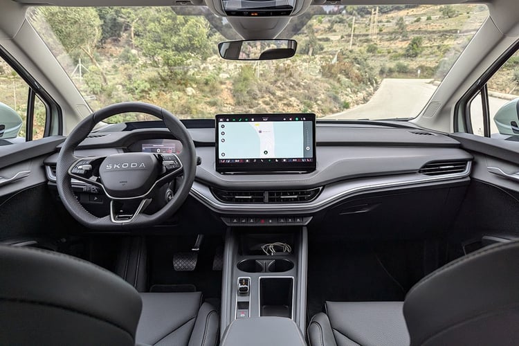 C’est lui qui a tout appris à son petit frère. D’une longueur de 4,65 m, l’Enyaq fait une tête de plus et commence à occuper vraiment plus de place au sol. La raison ? Un porte-à-faux arrière étiré qui profite au volume du coffre, annoncé à 585 l pour un maximum de 1 710 l avec la banquette à plat. Cependant, malgré les apparence, l’empattement de 2,77 m est identique à son petit frère. On y retrouve donc une habitabilité équivalente à l’arrière. Même chose à l’avant avec, de surcroît, une planche de bord parfaitement identique entre les deux modèles. Le Skoda Enyaq n’est donc qu’un Elroq plus grand, ou inversement. Une filiation maintenant évidente avec le modèle restylé.