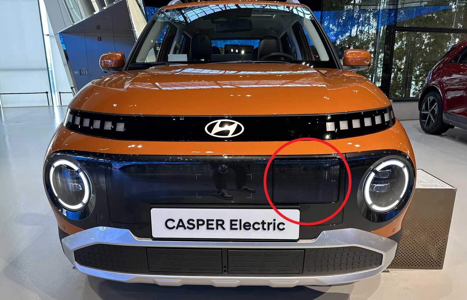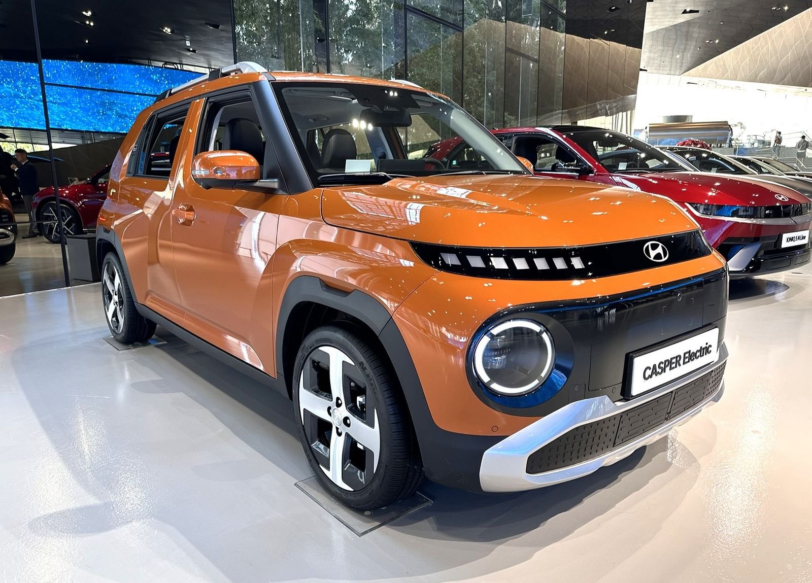 En matière de design, on accroche immédiatement avec les lignes du modèle de démo exposé au Hyundai Motor Studio de Goyang, à l’ouest de Séoul. Caractérisée par sa calandre pleine et ses optiques rondes, la petite voiture électrique de Hyundai sait jouer sur les détails pour se rendre sympathique. Ainsi avec les smileys intégrés aux montants des portes arrière (qui ne semblent pas présents sur la version européenne) où le bandeau pixels à l’arrière directement hérité de la Hyundai Ioniq 5.