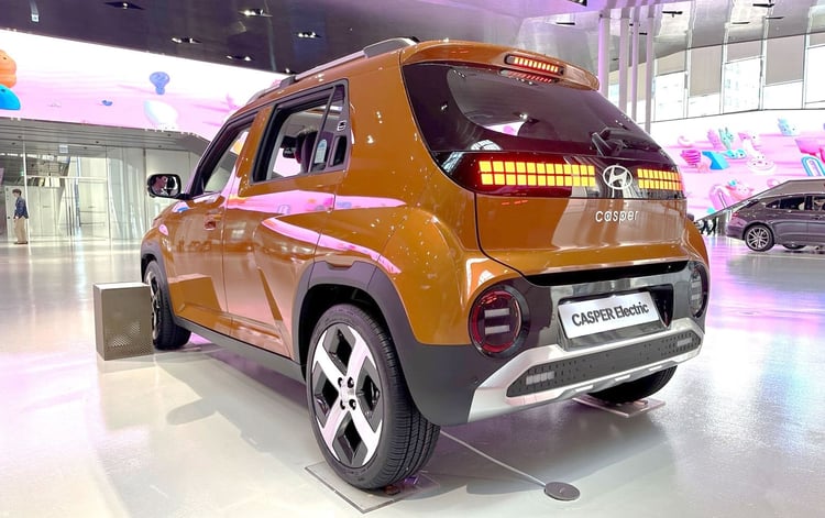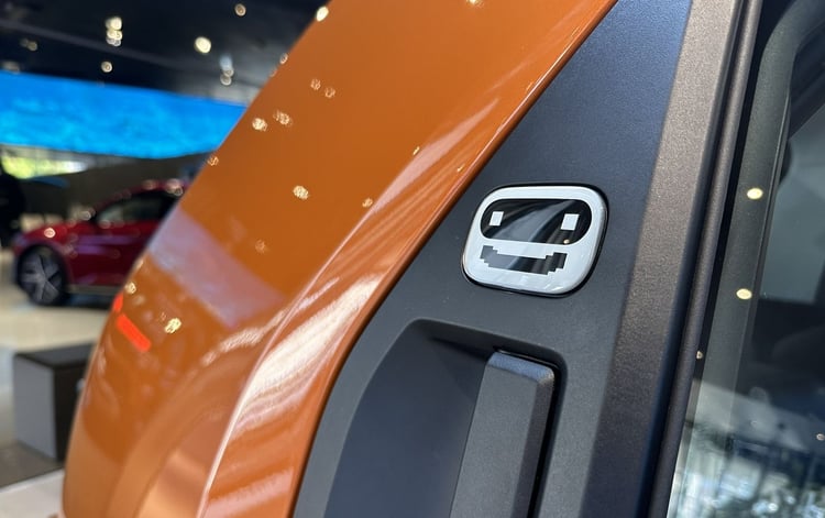 En matière de design, on accroche immédiatement avec les lignes du modèle de démo exposé au Hyundai Motor Studio de Goyang, à l’ouest de Séoul. Caractérisée par sa calandre pleine et ses optiques rondes, la petite voiture électrique de Hyundai sait jouer sur les détails pour se rendre sympathique. Ainsi avec les smileys intégrés aux montants des portes arrière (qui ne semblent pas présents sur la version européenne) où le bandeau pixels à l’arrière directement hérité de la Hyundai Ioniq 5.