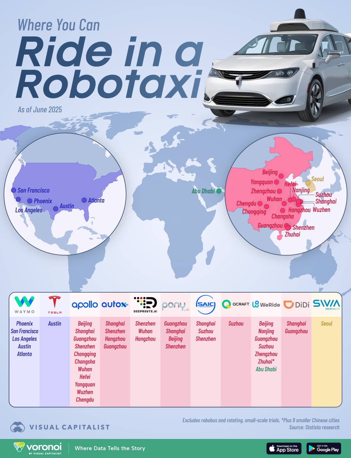Dans le domaine de la conduite autonome, il y a la Chine d’un côté, et les États-Unis de l’autre. Dans le pays de l’oncle Sam, c’est une filiale de Google qui fait office de champion. Créé en 2009 sous le nom de Google Self-Driving Car Project, Waymo est désormais présent à Phœnix, San Francisco, Los Angeles, Austin et Atlanta (1 500 robotaxis). La société californienne a annoncé début 2025 qu’elle allait s’étendre à San Diego, Las Vegas, Miami et Tokyo (sa toute première expansion internationale).