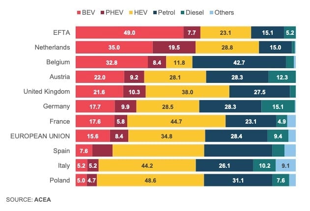 Devant la France, on retrouve également la Belgique (avec une part de 32,8 % sur les voitures électriques), l’Autriche (22 %), le Royaume-Uni (21,6 %) et l’Allemagne (17,7 %). En bas de classement, on a l’Espagne (7,6 %), l’Italie (5,2 %) ou encore la Pologne (5 %). Dans ces trois derniers pays, la part de l’hybride est particulièrement importante. C’est justement en Pologne que les véhicules hybrides sont les plus représentés avec une part de marché qui avoisine les 50 %.