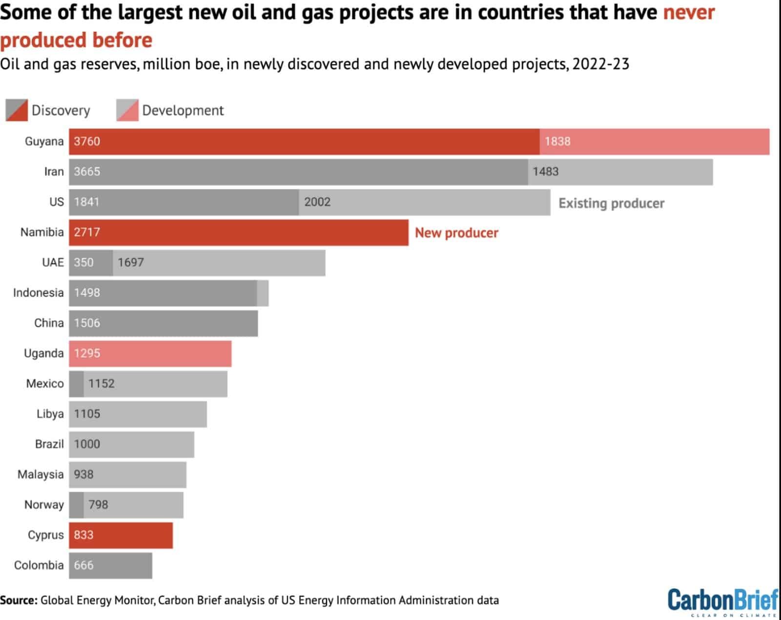 Le Guyana est le pays qui produira le plus d’énergies fossiles à l’horizon 2035. C’est également le pays dans lequel ont été découverts le plus de gisements, devant l’Iran. Et c’est aussi le pays qui en a le plus en phase de finalisation actuellement.