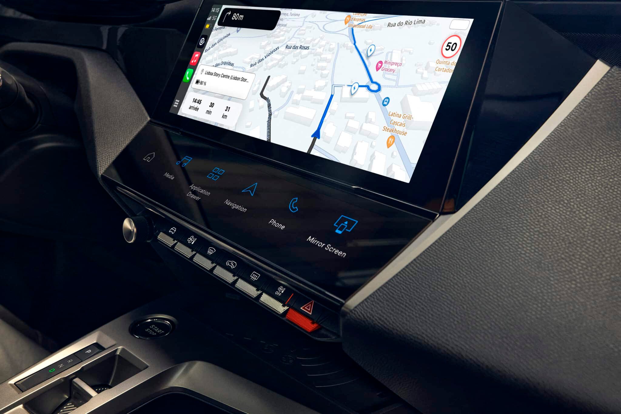 Sous l’écran central, le bandeau noir accueille les cinq i-Toggles tactiles, configurables selon les préférences du conducteur : raccourci vers la climatisation, station de radio favorite, navigation vers le domicile, ou même le contact d’un proche. Un détail intelligent, pensé pour éviter la multiplication des menus et favoriser l’intuition au volant.