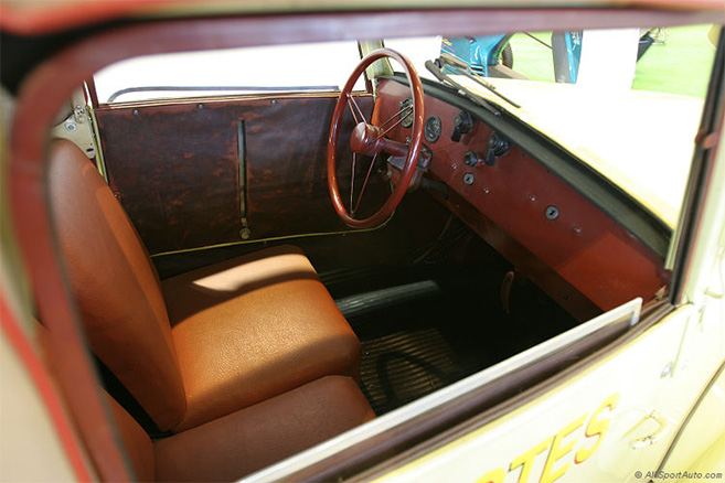Sans doute serait-on tenté de dire que la planche de bord fait triste mine. C’est cependant un quasi standard, à l’époque. Et la guerre n’y est pas pour grand chose. Deux cadrans se cachent derrière le volant : le compteur de vitesse totalisateur kilométrique, et l’ampèremètre. Plus à droite, le commutateur à 4 positions qui gère l’éclairage et la signalisation extérieurs. On y trouve aussi le frein à main en partie basse. Quant à l’inverseur de sens de fonctionnement, il est partiellement dissimulé sous le siège du conducteur.
