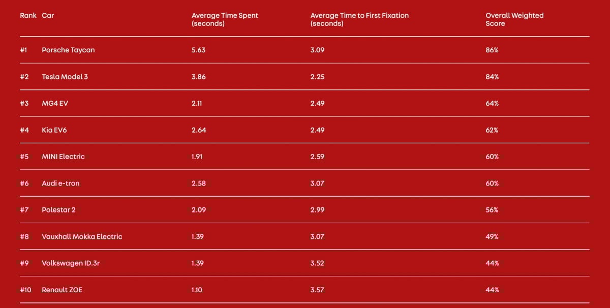 Cependant, sur le strict plan des scores, la Tesla Model 3 a de l’intérêt aux yeux des participants, que ce soit en matière de style pur avec une accroche plus rapide qu’une Porsche 911 (2,25 s), et un temps d’observation le plus long de la sélection, derrière la Taycan. Suffisant pour qualifier la Model 3 de belle voiture ? Sûrement pas. Reste à savoir si la photo qui a été présentée aux participants concerne bien une Model 3, et non pas une Model S comme affichée sur le site de l’organisme.