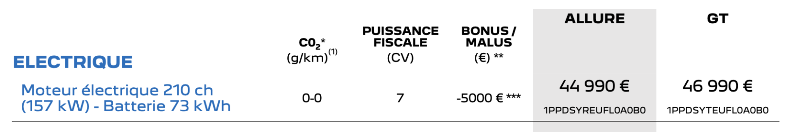 Peugeot tient donc à souligner que les prix catalogue sont bien de 44.990 et 46.990 €, comme cela est mentionné dans la brochure que le constructeur vient de nous fournir et dont voici l’extrait. Nous avons donc été induits en erreur par un bug d’affichage.