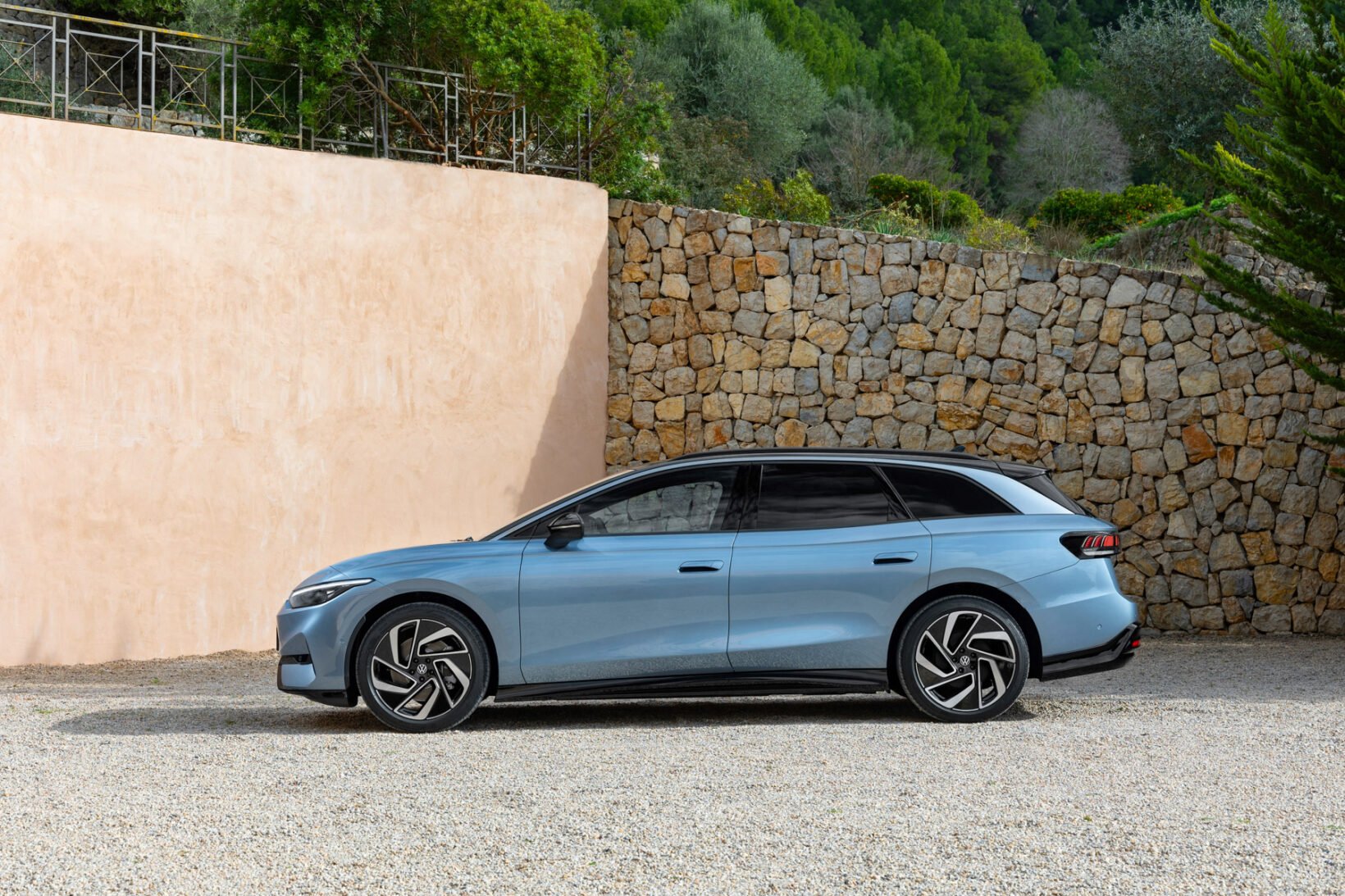 Quoi qu’il en soit, à sa manière, l’ID.7 Tourer affiche un style moderne, bien proportionné, avec des porte-à-faux assez courts et une allure plongeante à l’avant comme à l’arrière. Il faut dire que livrée bi-ton que nous avons sous les yeux, avec sa ligne de toit argentée et noire, renforce l’impression d’une silhouette rabaissée.
