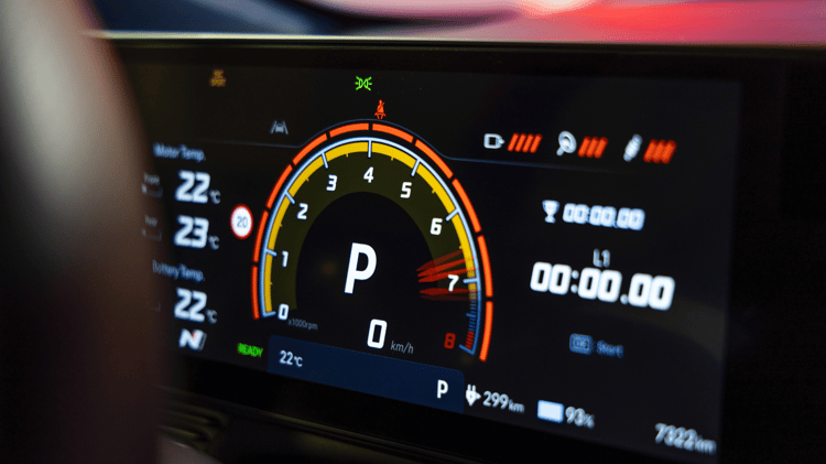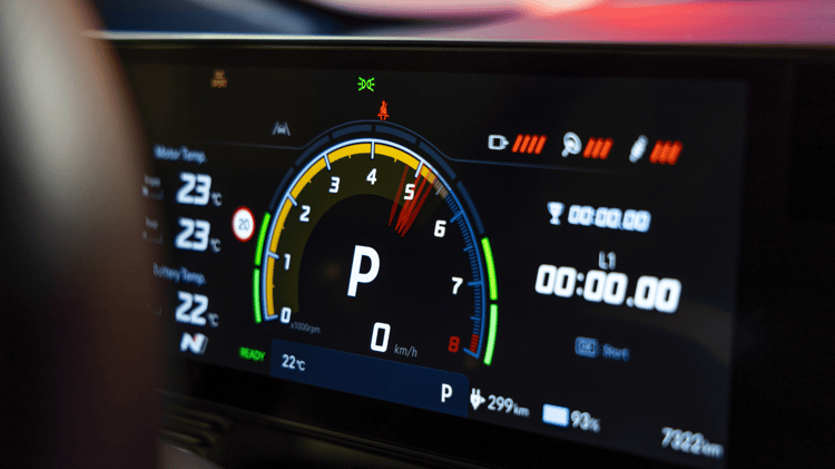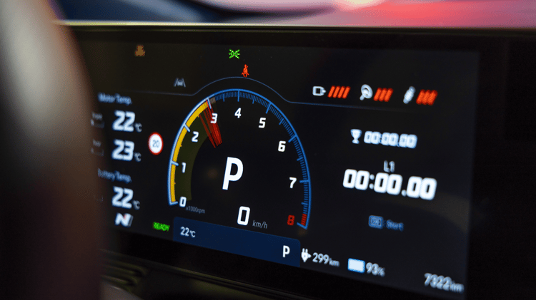 Pour la section « retour » de l’Autobahn, nous activons via l’écran central les deux artifices les plus surprenants de la voiture. D’un côté, le « N Active Sound » supposé rappeler la rage d’un moteur à combustion interne. De l’autre, le « N e-shift », imitant les passages de rapports et gérant le couple de manière à singer une boîte de vitesse à double embrayage et huit rapports. Notons ici que l’on se perd un peu dans la forêt de menus et de personnalisations disponibles, mais passons.