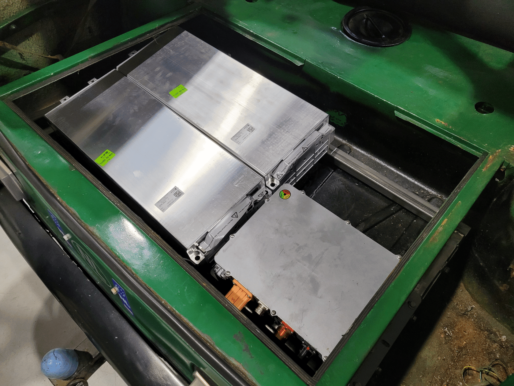 Si c’est l’opération la plus simple, elle nécessite tout de même l’élaboration d’une pièce sur mesure permettant d’accoupler transmission et moteur électrique, ainsi que de faire à peine de place au niveau du train avant pour accueillir ce dernier, la seule altération que nous avons due faire. Le volume restant sera alors suffisant pour accueillir l’onduleur et son radiateur derrière la calandre, ainsi que deux modules de batterie par-dessus.
