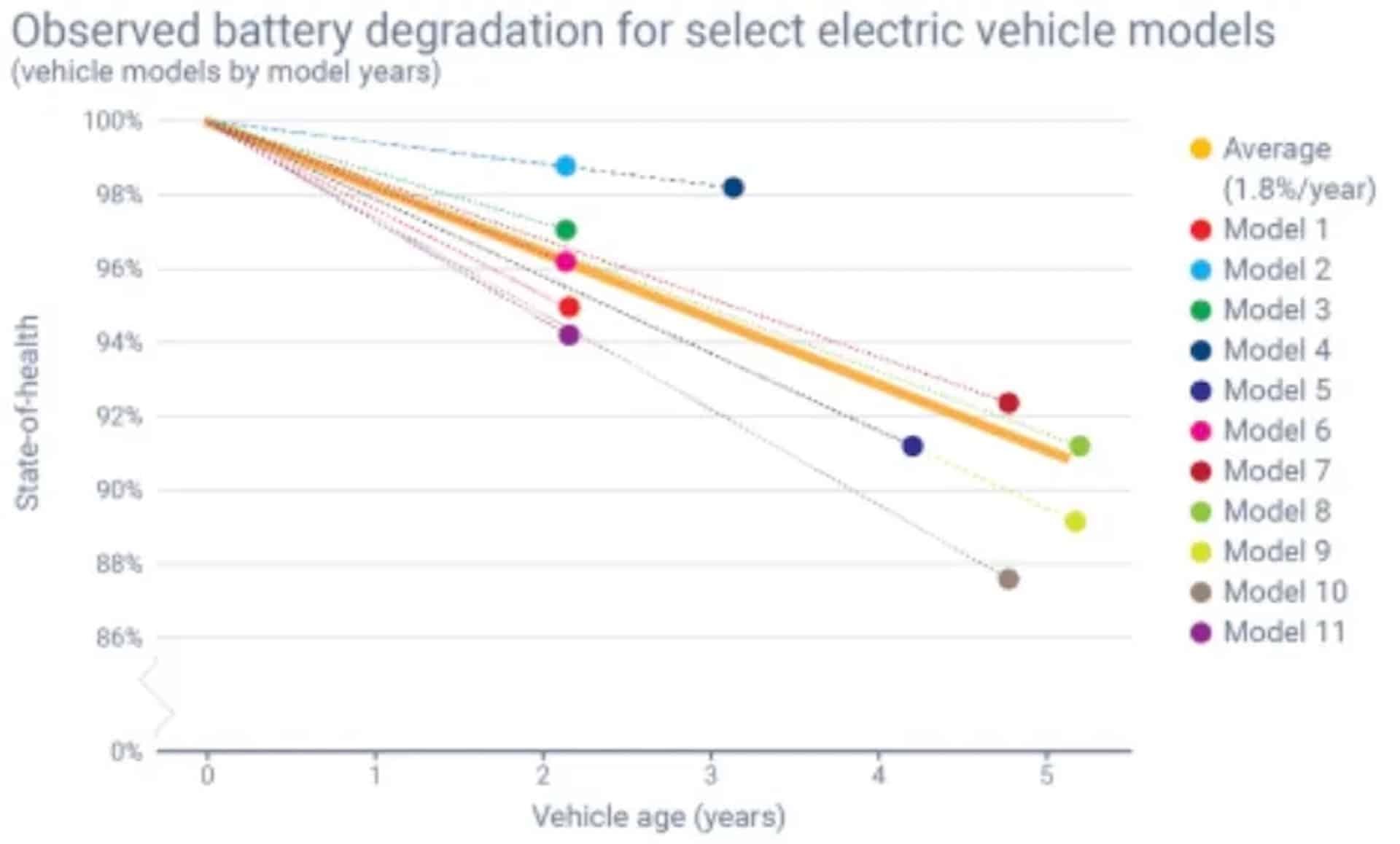 Voici ce qu’il reste de la capacité de la batterie d’une Volkswagen ID.3 après 100 000 kilomètresLes chercheurs ont également constaté qu’il existe des différences significatives en fonction des modèles. Ce qui est tout à fait normal étant donné qu’ils ne disposent pas des même batteries. En tout, 11 véhicules électriques différents ont été analysés. Mais Geotab a préféré ne pas les nommer.