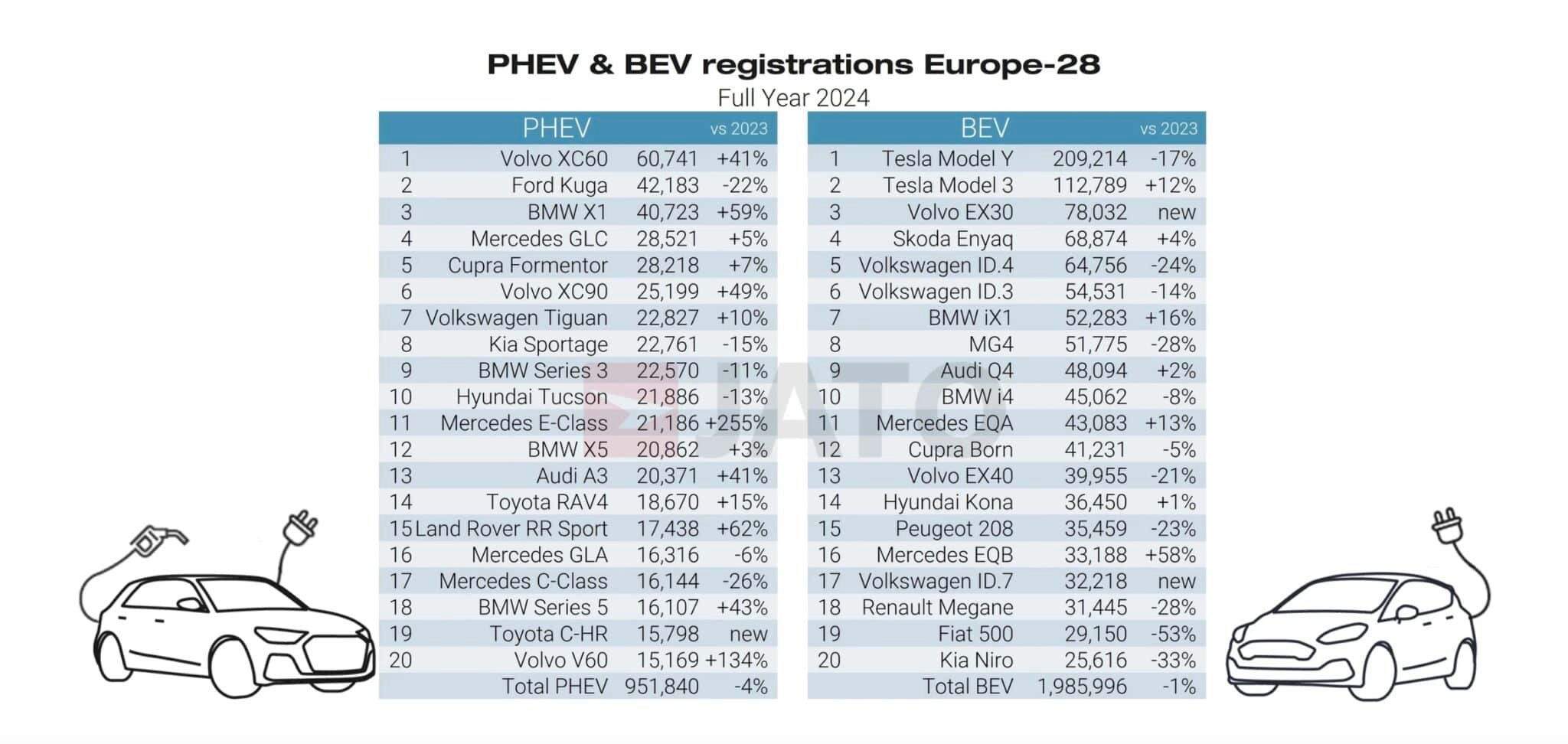 Derrière on a les Skoda Enyaq (68 874), Volkswagen ID.4 (64 756), Volkswagen ID.3 (54 531), BMW iX1 (52 283), MG4 (51 775), Audi Q4 (48 094) et BMW i4 (45 062) à la 10e place. Il faut attendre la 15e place pour trouver une voiture française avec la Peugeot 208 (35 459). La Renault Mégane E-Tech se place également dans ce Top 20 à la 18e place (31 445). Il est étonnant de ne pas voir la Hyundai Ioniq 5.