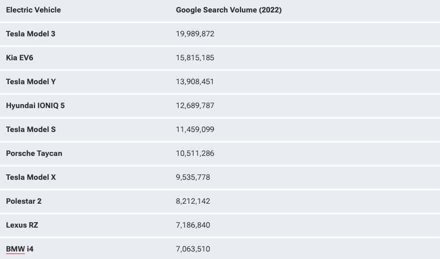 Sans surprise, Tesla arrive en tête sur de nombreux marchés. En Europe, la Tesla Model Y est même le véhicule le plus populaire. Plus de 317 véhicules ont été passés au crible. Voici le top 3 mondial : la Model 3 arrive en tête avec un volume conséquent de 20 millions de recherches sur Google. Deuxième position assez surprenante du Kia EV6 (15,8 millions), qui vole la vedette à la Model Y (13,9 millions).