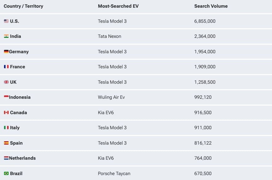 Globalement, ce qui ressort du classement, c’est que les internautes cherchent des véhicules en fonction de leur zone géographique. En Inde, le modèle électrique qui arrive en tête est la Tata Nexon (fabriquée en Inde). La Rimac Nevera (fabriquée en Croatie) est la voiture la plus recherchée sur Google dans plusieurs pays des Balkans. En Indonésie, la Wuling Air EV arrive en tête (marque chinoise mais un modèle fabriqué en Indonésie). Aux États-Unis, la Model 3 est loin devant.