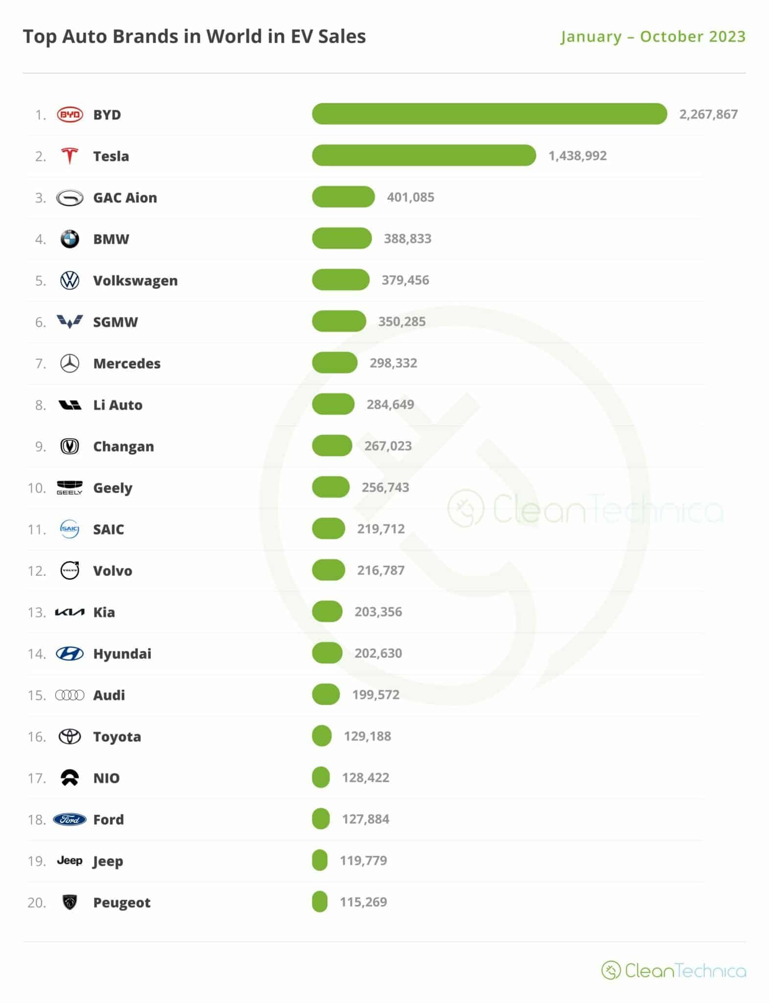 Sur l’ensemble de l’année (de janvier à octobre), le podium des marques qui distribuent le plus de modèles électrifiés est quasiment déjà déterminé. BYD est loin devant le reste du peloton. En effet, sur les dix premiers mois de l’année, la marque chinoise a écoulé 2 267 867 modèles rechargeables. C’est beaucoup plus que Tesla et ses 1 438 992 véhicules livrés. En troisième position on retrouve un autre chinois : Gac Aion. Li Auto et Changan font une percée en grimpant respectivement à la 8e et 9e place.