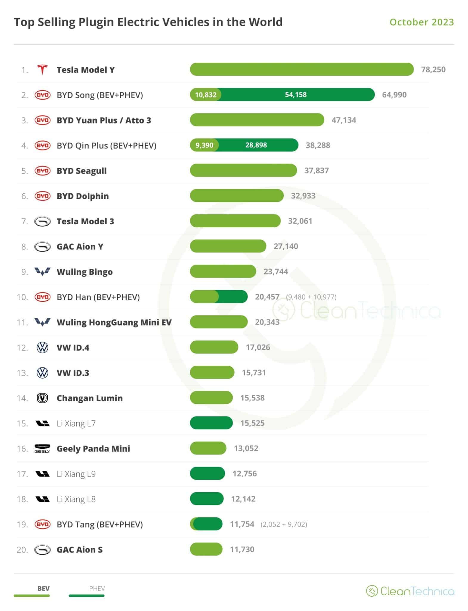 Ventes de voitures électriques : quel impact a la fin progressive du bonus en Allemagne ?Sur les vingt modèles électrifiés les plus vendus au monde, il n’y a pas vraiment de surprise. Le Tesla Model Y est (pour le moment) le roi incontesté avec 78 250 immatriculations sur le mois d’octobre 2023. Derrière le modèle américain, on retrouve une flopée de voitures chinoises. Sept véhicules proviennent de chez BYD, dont cinq juste derrière le Model Y comme vous pouvez le constater sur le graphique de Clean Technica.