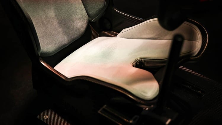 Les sièges baquets sont faits en carbone, tout comme la structure de carrosserie que la marque appelle « superstructure en carbone ». Le pilote a devant lui le double écran de 10,1 et 10,25 pouces issus du modèle E-Tech avec une interface spécifique qui s’inspire des tableaux de bord des modèles Turbo d’époque. Un frein à main vertical façon voiture de rallye à commande électronique fait son apparition. Notons que celui-ci n’est utilisable que sur circuit, car la voiture est également dotée d’un frein de stationnement classique.