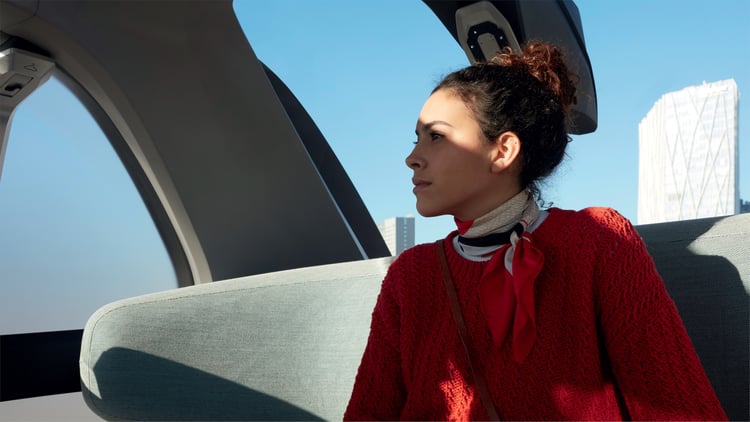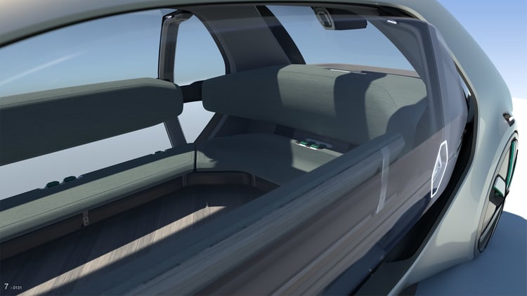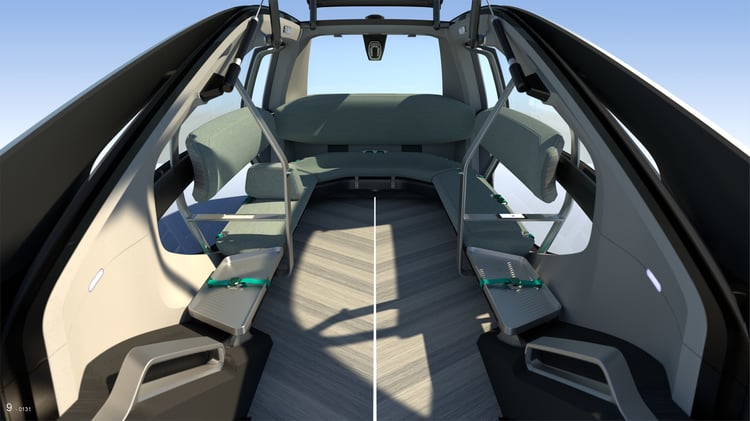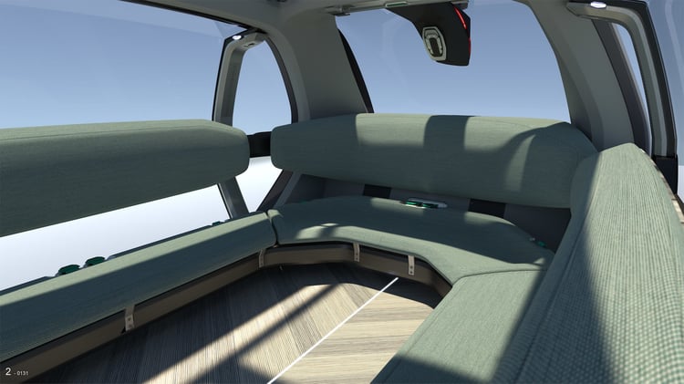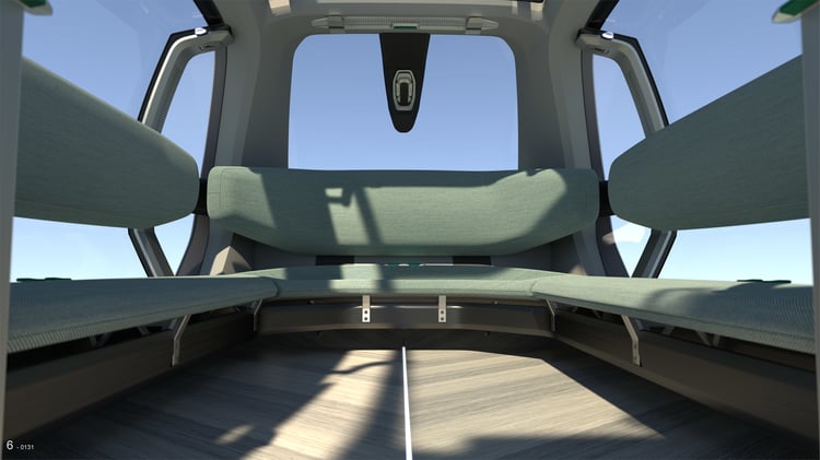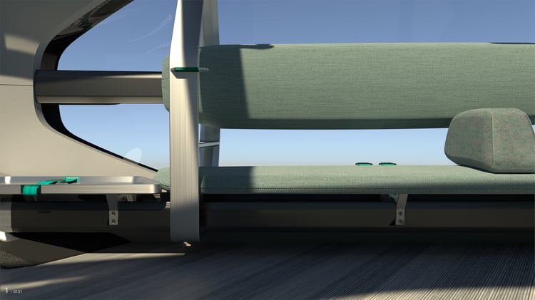 A l’intérieur, le sol est revêtu d’un plancher en bois et les passagers prennent place sur une banquette circulaire d’apparence confortable. De larges baies vitrées panoramiques inondent l’habitacle de lumière et un écran allongé à la manière d’un plan de métro fournit des indications sur le trajet.