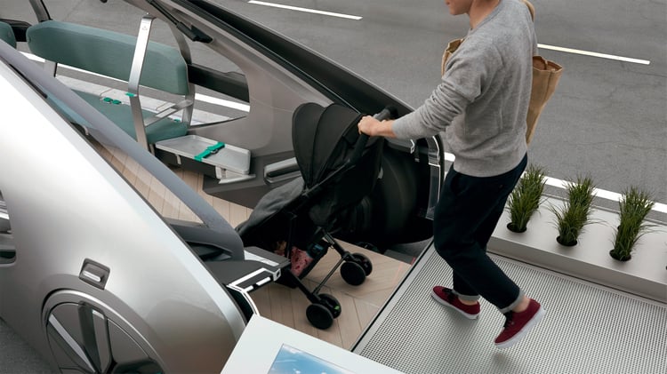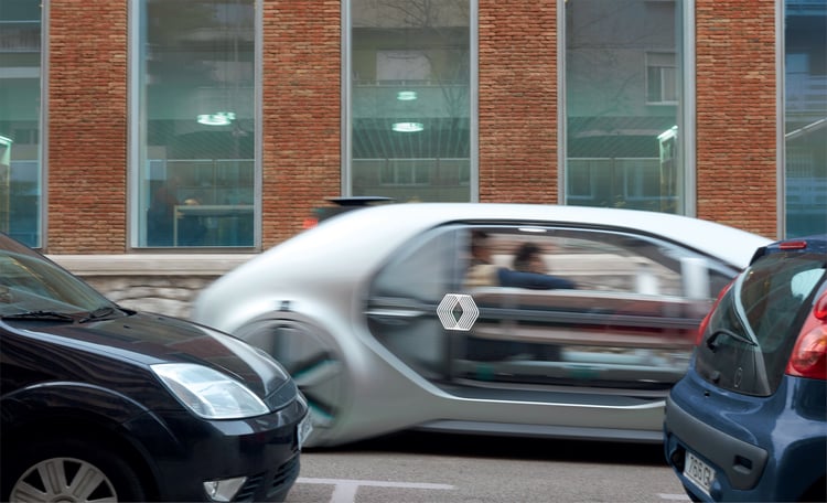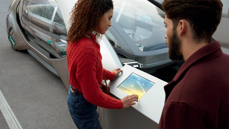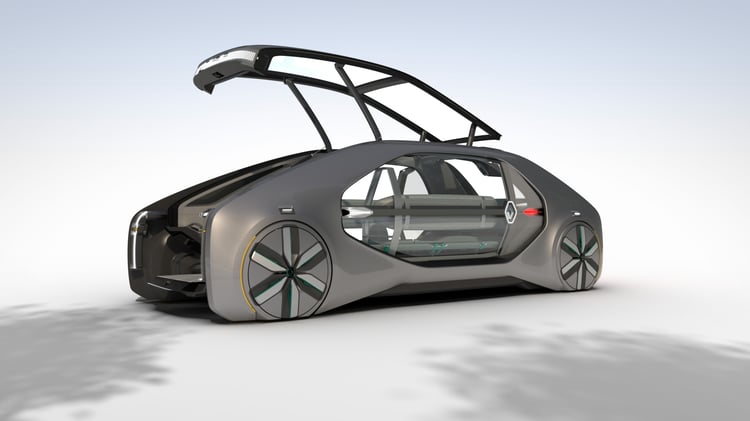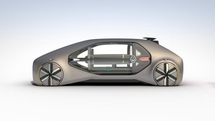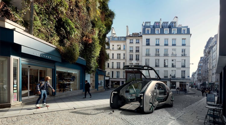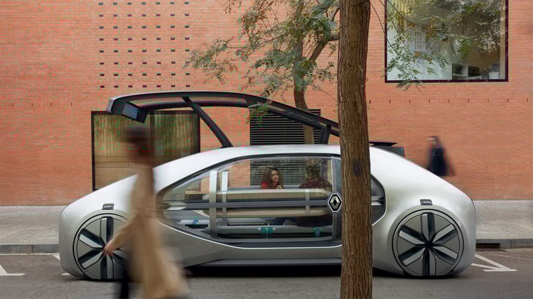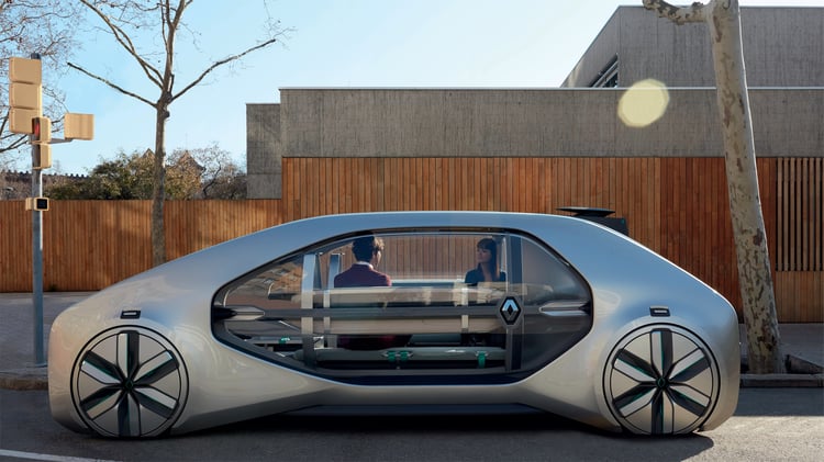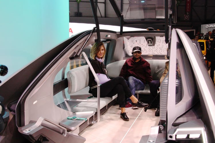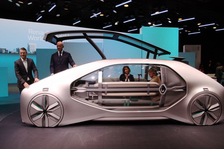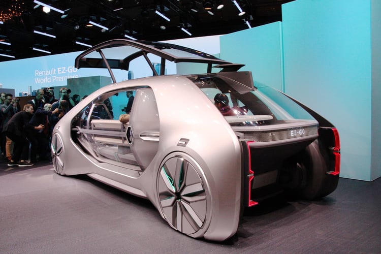 Sur le stand de Renault, le prototype EZ-GO étonne : ce n’est pas l’un des ces concept-cars aux performances décoiffantes ni l’esquisse d’un futur modèle doté d’une méga-batterie. Le véhicule propose une vision très différente de l’automobile qui se rapproche plus du transport public que de la mobilité individuelle.