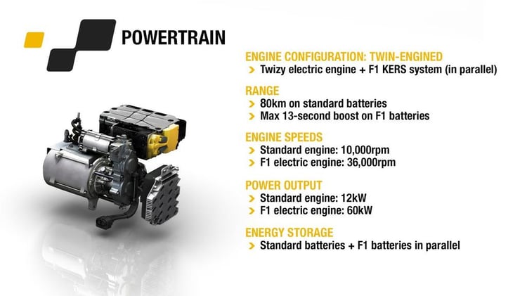 Les ingénieurs de Renault Sport ont fait évoluer la motorisation du Twizy en intégrant notamment un système KERS issu du monde de la F1. Il a pour effet de faire passer la puissance de l’engin à 100 ch ! Le 0 à 100 km/h est donc abattu en quelques secondes selon Renault.
