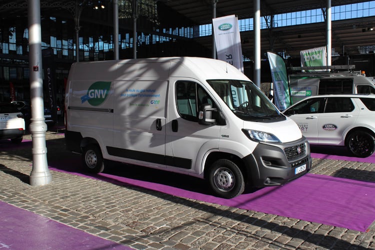 A l’extérieur du bâtiment, mais à l’abri du Soleil, peu d’utilitaires fonctionnant avec une énergie dite alternative. Le GNV n’était visiblement représenté que par un Fiat Ducato.