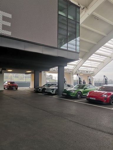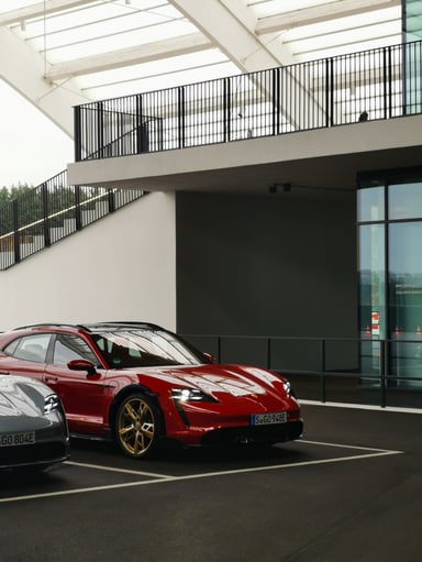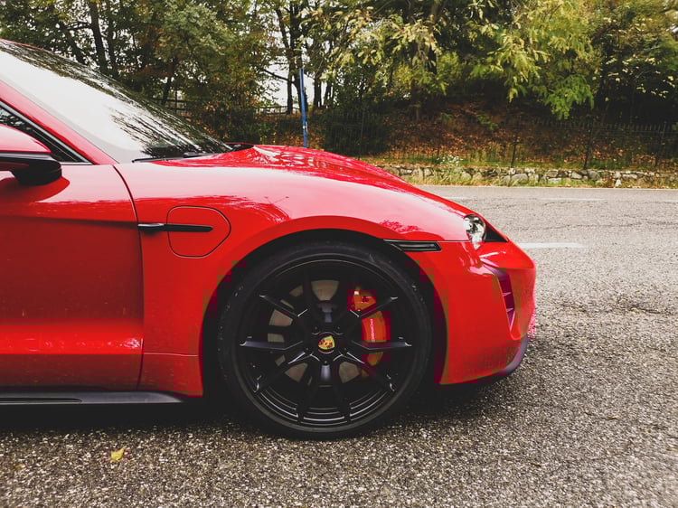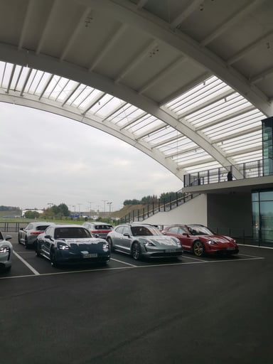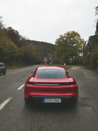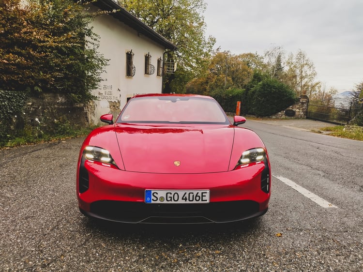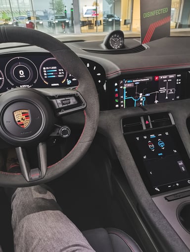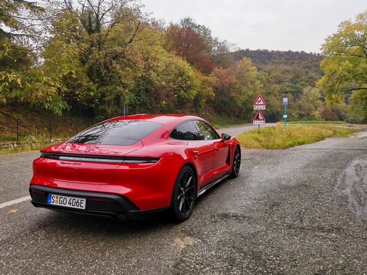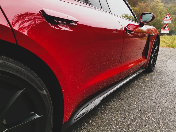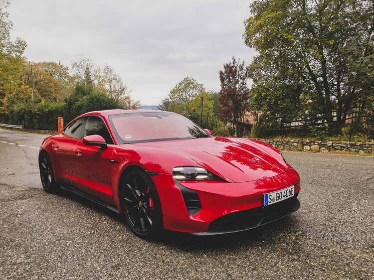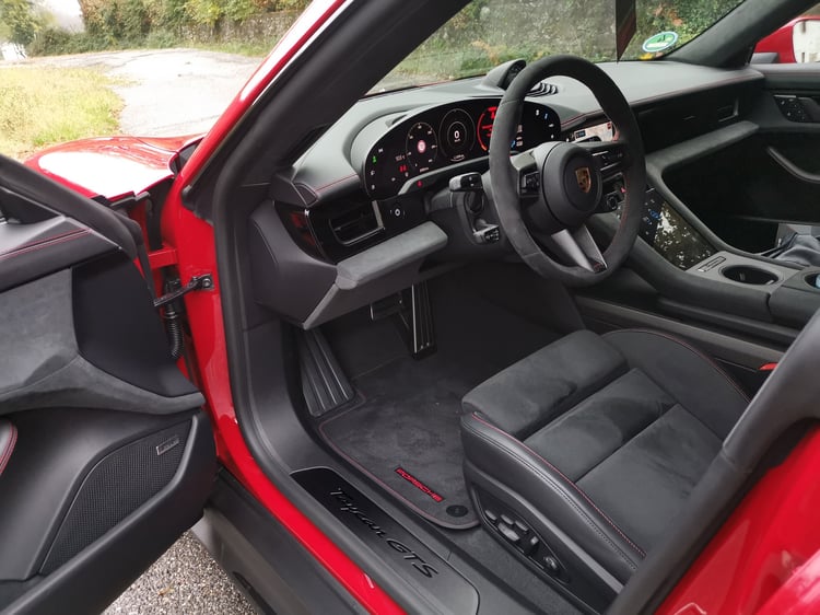 En attendant le nouveau Macan électrique, Porsche nous proposait alors toute une série de Taycan millésime 2023 à essayer, l’embarras du choix ! Courte session de roulage, routes réjouissantes, une Taycan à choisir : on misera sur l’efficience une autre fois, place à la plus dynamique et agile Taycan GTS, ses jantes noir mat et son rouge Carmin bien reconnaissables. Sacré look, même si les Sport Turismo à côté me font de l’œil… À bord, l’alcantara étendu et les touches de rouge montrent bien l’appartenance à la griffe GTS : l’intérieur garde un savant mélange « cockpit de Porsche dédié à la conduite » et design épuré et futuriste. Du bel ouvrage.