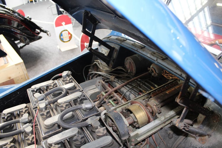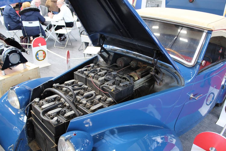 Entre les 2, sur le stand de la FFVE, un coupé Rosengart Supersept Sutosix de 1938 équipé d’un moteur électrique ajouté en 1940 et bien mis en évidence sur une caisse en bois. Une seule de ces voitures dévoilait ses entrailles lors de notre passage : une des 200 CGE Tudor produites entre 1941 et 1942.