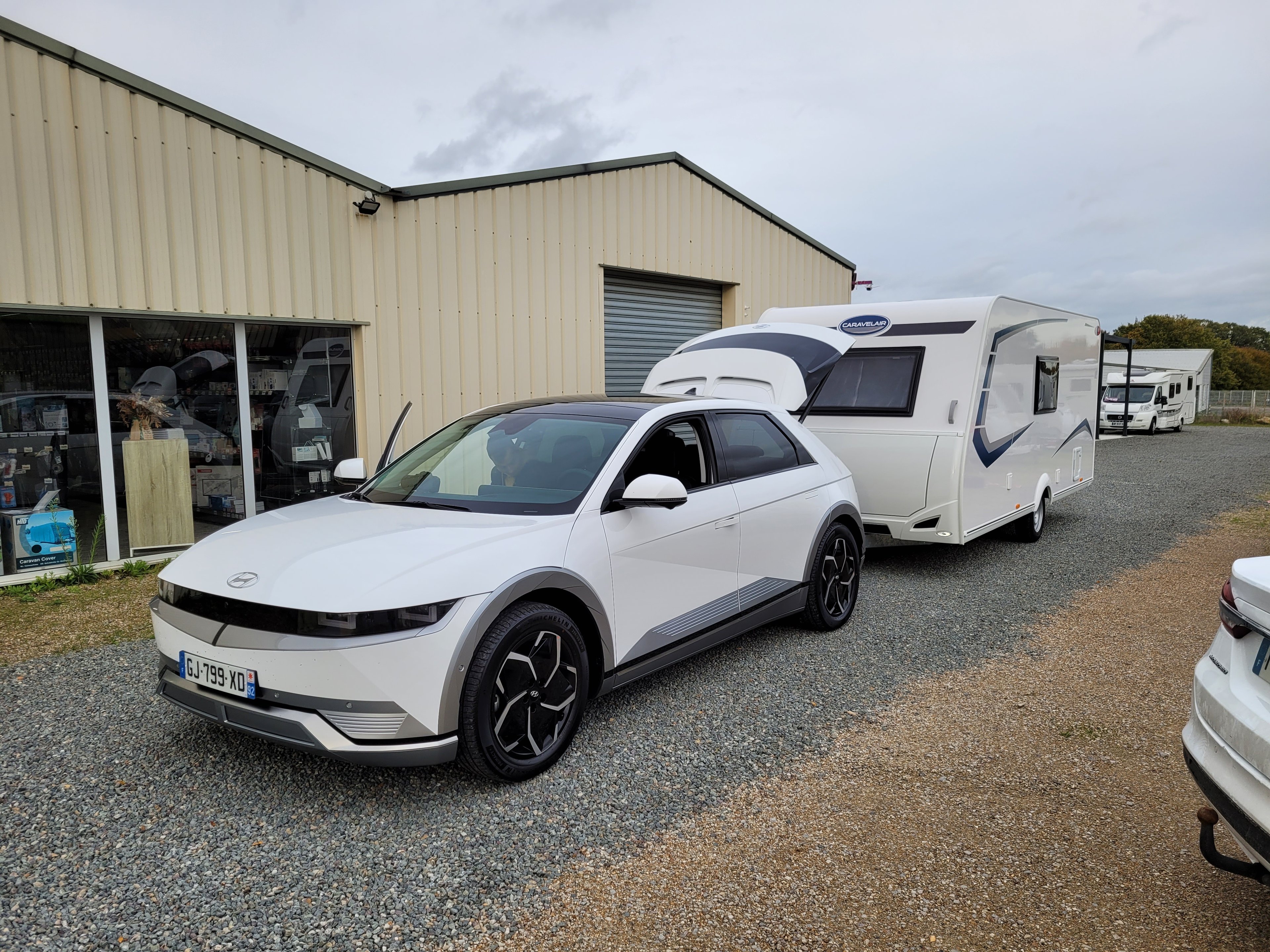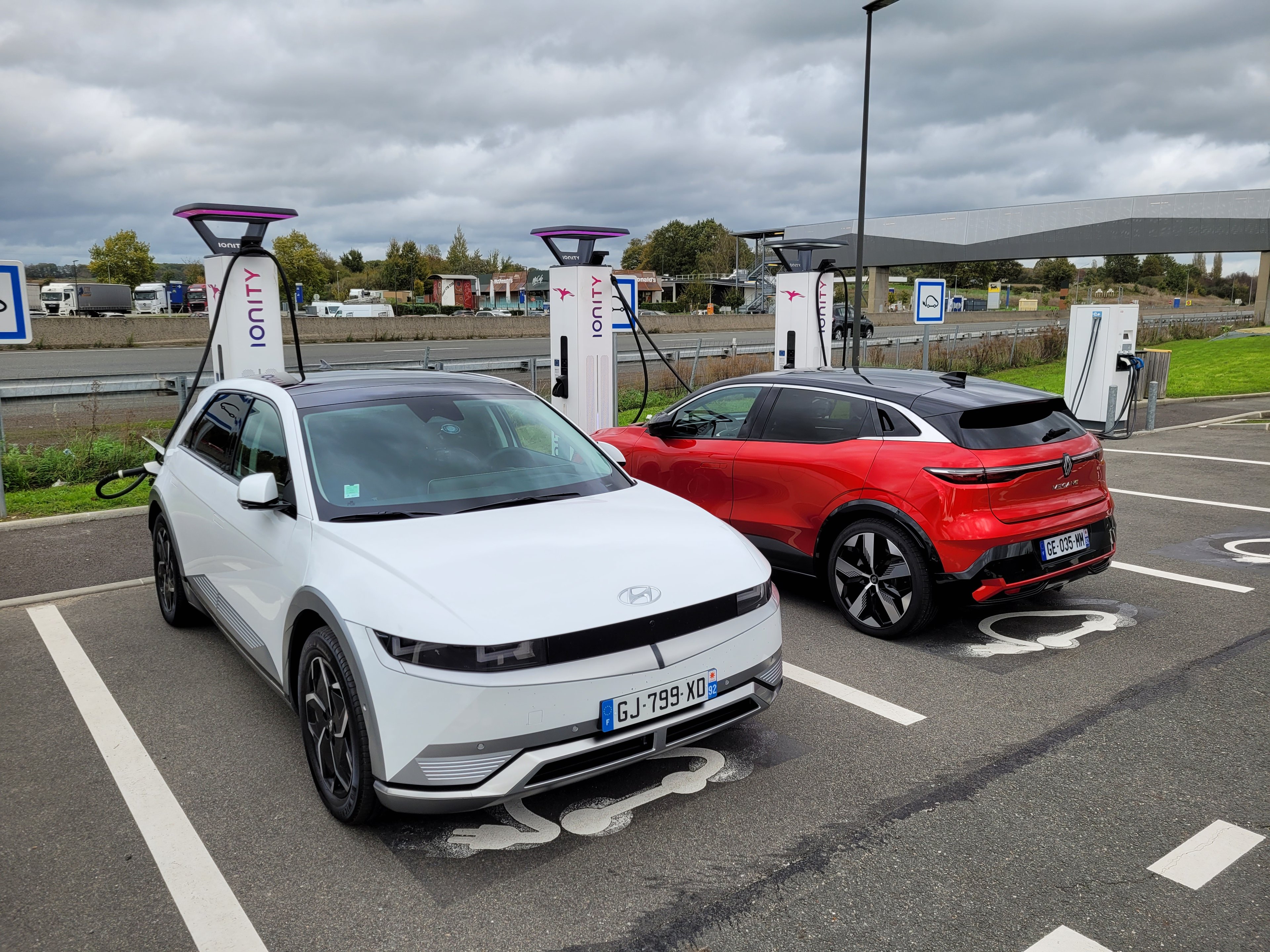 Évidemment, à l’heure de pointe, Paris étant Paris, notre planning réglé soigneusement à la minute est bon à jeter du côté recyclable de la corbeille dès les premiers kilomètres de bouchons bien plus denses que prévus et ce n’est qu’à midi que nous parvenons au lieu de notre première recharge à la station Ionity de la Ferté Bernard sur l’A11. Consommations moyennes sur le trajet constatées au régulateur de vitesse à 110 km/h ? Vu les conditions climatiques de novembre, un tout à fait respectable 17,7 kWh/100 km pour la Renault et un plus gourmand 21,8 kWh/100 km pour la Hyundai. Mais c’est surtout la comparaison de ces chiffres à ceux que nous enregistrerons dans des conditions similaires en tractant une caravane qui nous intéresse.