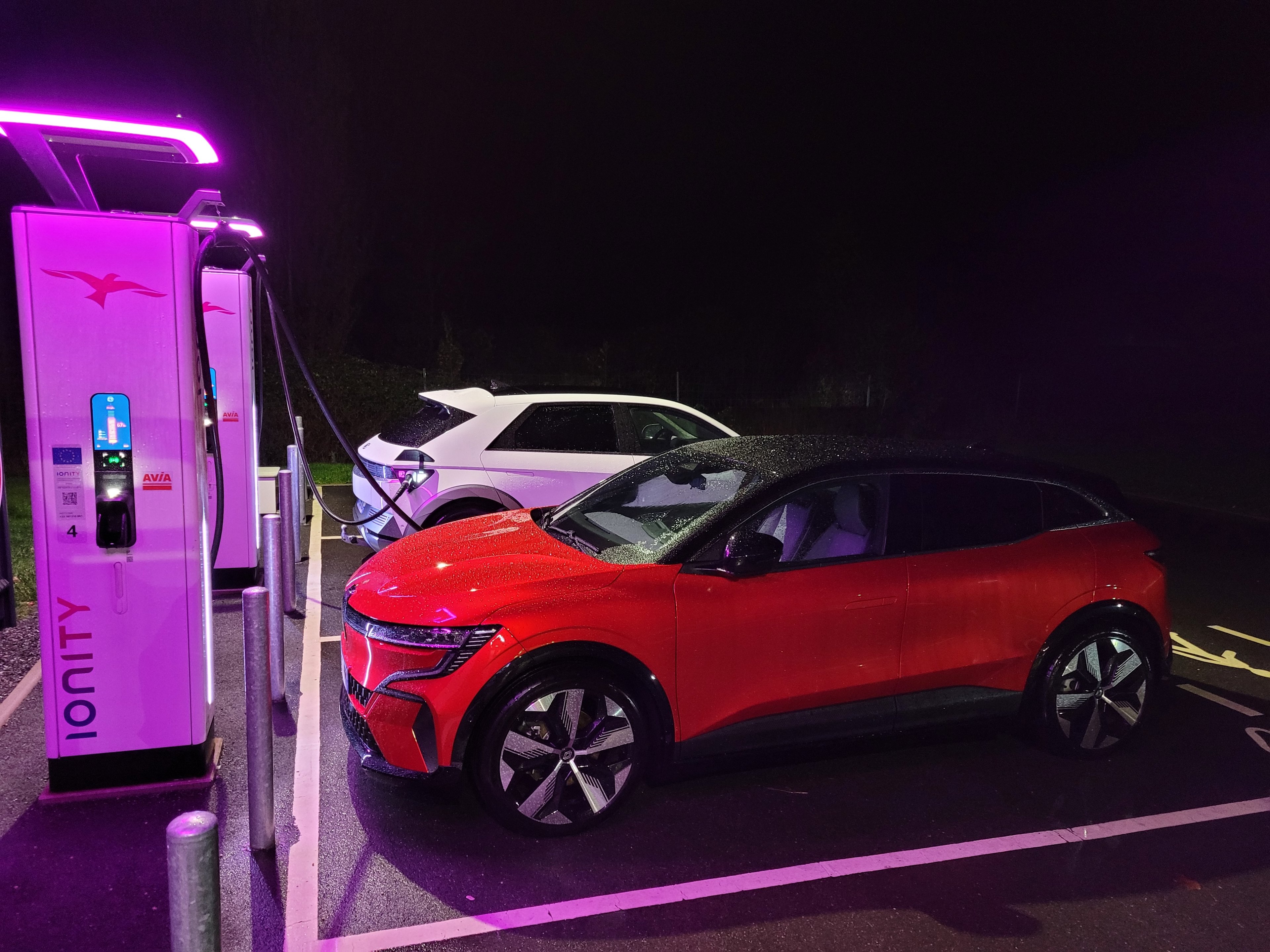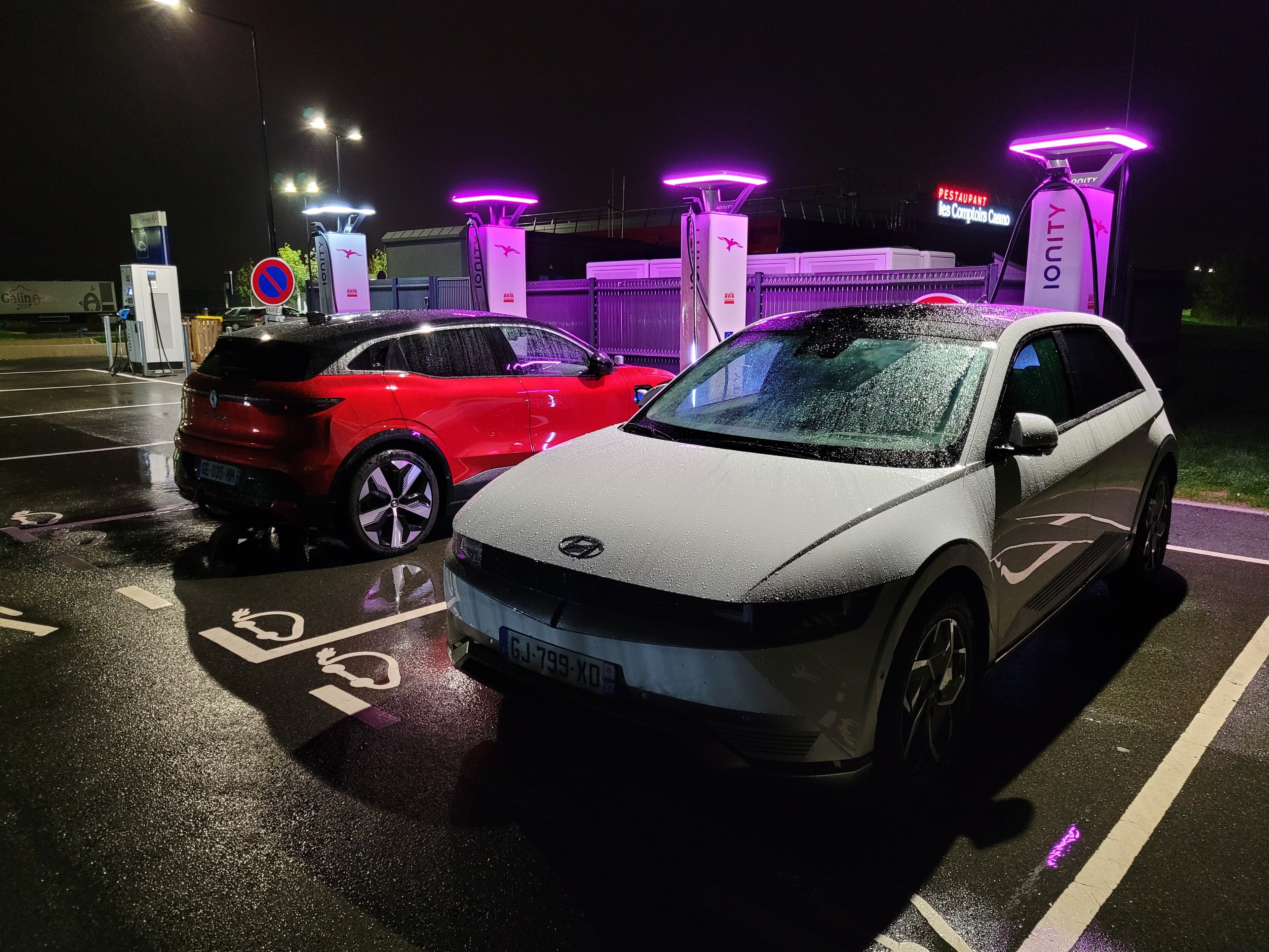 Les photos sur ChargeMap laissées par les utilisateurs sont alors très utiles pour déterminer à l’avance la configuration des lieux : on espérait que le positionnement à l’avant droit de la prise de la Mégane nous permettrait au moins de charger tel quel alors que celle à l’arrière droit de la Hyundai ne nous laissait pas grand espoir mais, pas de miracle, vu l’accès serré et à quasi angle droit du site des bornes, il faudra désateler les deux caravanes. Arrivés à l’aire, nous nous dirigeons donc dans un premier temps côté poids lourds pour larguer les caravanes. Après la théorie apprise chez Caravane 2000, notre première fois se fait donc à la nuit tombée et sous la pluie. Le grand bain directement. Mais si les étapes sont nombreuses, elles restent logiques dans leur succession et la séparation se fait sans encombre. Puis, abandonnant nos logis à roulettes entre deux routiers, nous reprenons les voitures pour faire tout le tour de l’aire afin de rejoindre les bornes de recharge.