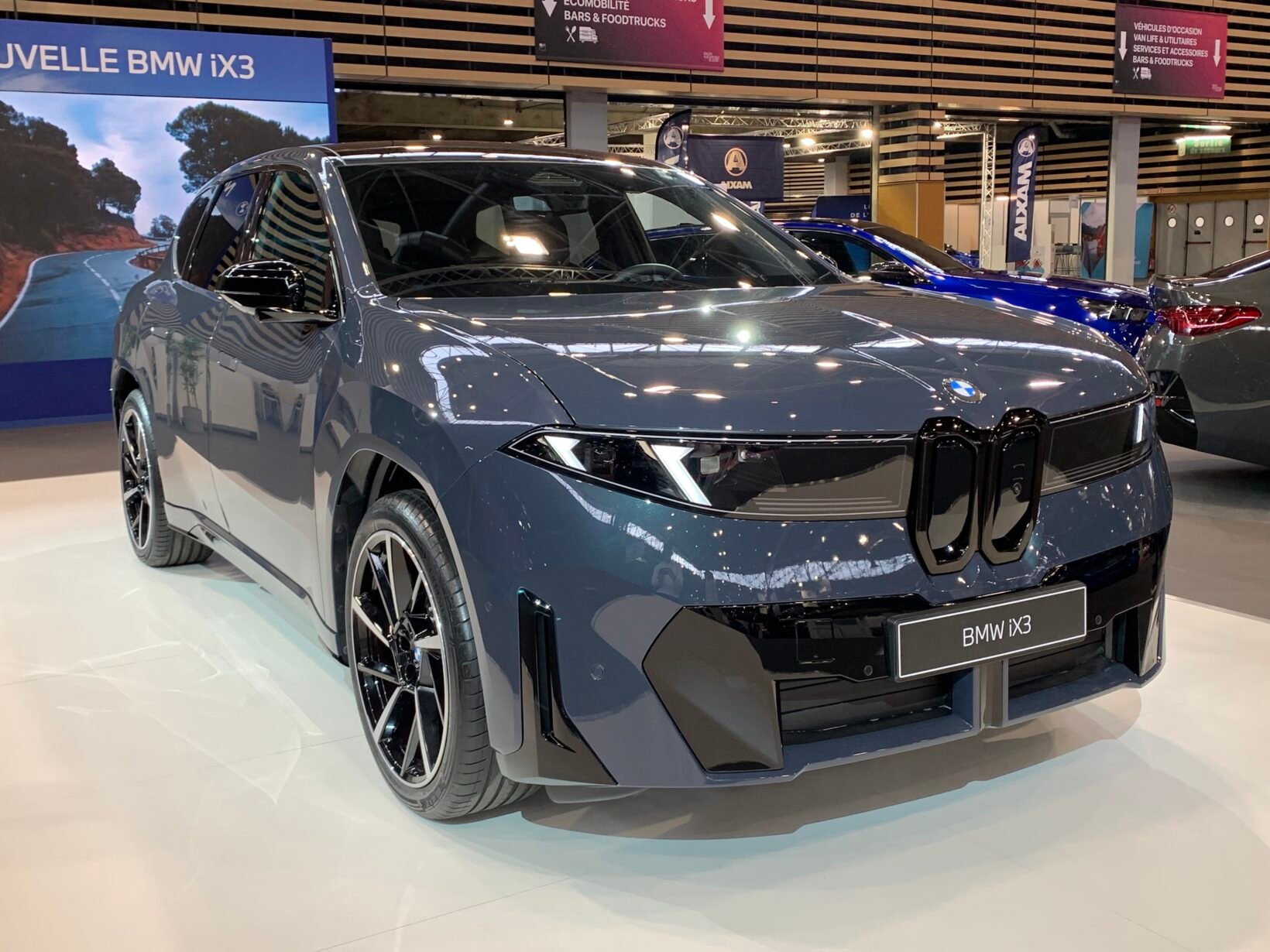 IAA Munich 2025 – Nouvelle Audi Q3 Sportback hybride rechargeable : du style et une très grosse autonomie électriqueBravo à BMW d’être venu à Lyon avec le nouvel iX3, à peine dévoilé (c’était début septembre à Munich) et qui n’est pas attendu dans les concessions avant mars 2026. Avec ce SUV, la firme allemande commence un nouveau chapitre de son histoire électrique. L’iX3 est la première BMW « Neue Klasse », sur une base pleinement adaptée à l’électrique. La fiche technique de la version de lancement xDrive50 envoie du lourd : architecture 800V, puissance de recharge maxi de 400 kW, 800 km d’autonomie ! La Neue Klasse, c’est aussi un look totalement revu, avec notamment une nouvelle calandre qui englobe les optiques, de chaque côté de haricots affinés. A bord, on trouve l’inédit BMW Panoramic Vision, un écran sur toute la base du pare-brise. Le prix de départ est déjà connu : 71 950 €.