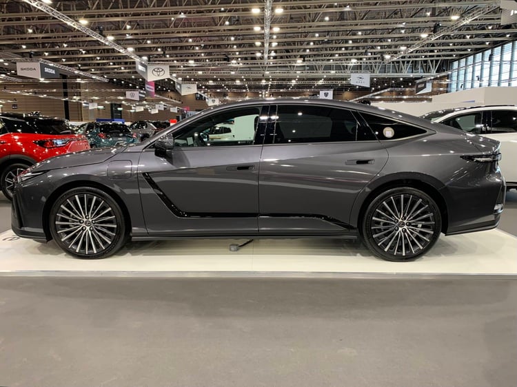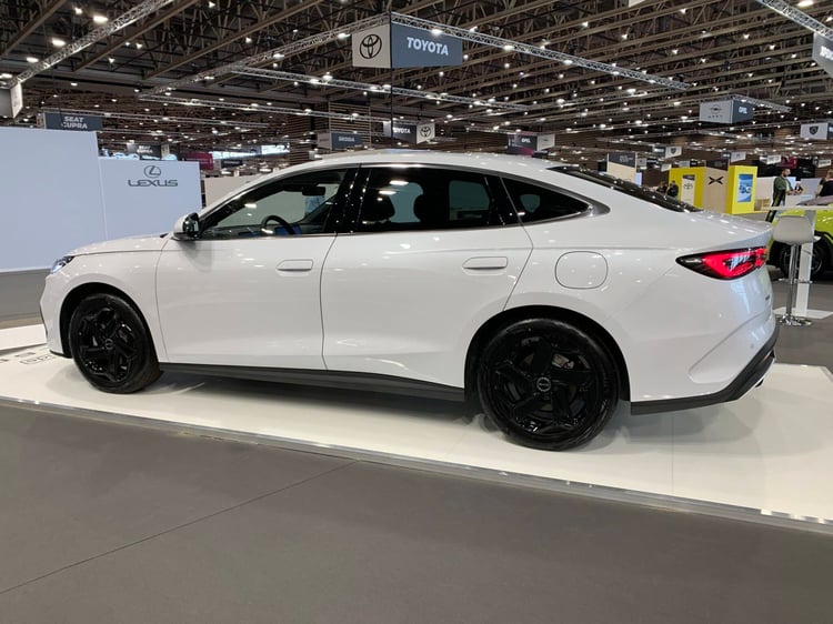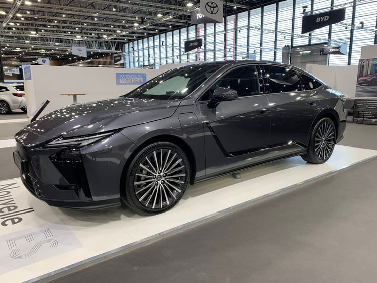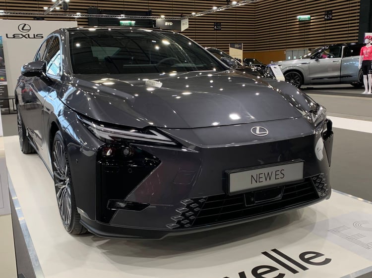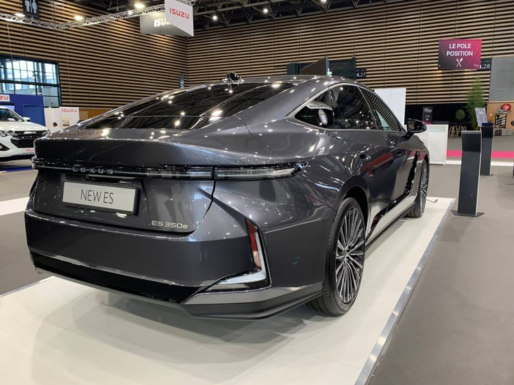 Il n’y a pas que des SUV à découvrir ! Lexus reste présent sur le marché des berlines traditionnelles avec une nouvelle génération de l’ES qui fait ses débuts en France à Lyon. Particularité : en plus de l’hybride simple (la 300h de 201 ch), l’ES propose maintenant des variantes 100 % électriques : la 350e traction avant, développant 224 ch et la 500e à transmission intégrale, d’une puissance de 343 ch. Avec une batterie de 77 kWh, la 350e promet 530 km d’autonomie, ce qui n’est pas si extraordinaire face aux rivales. La voiture se démarque avec son style taillé à la serpe, avec par exemple un curieux insert noir qui traverse les portes.