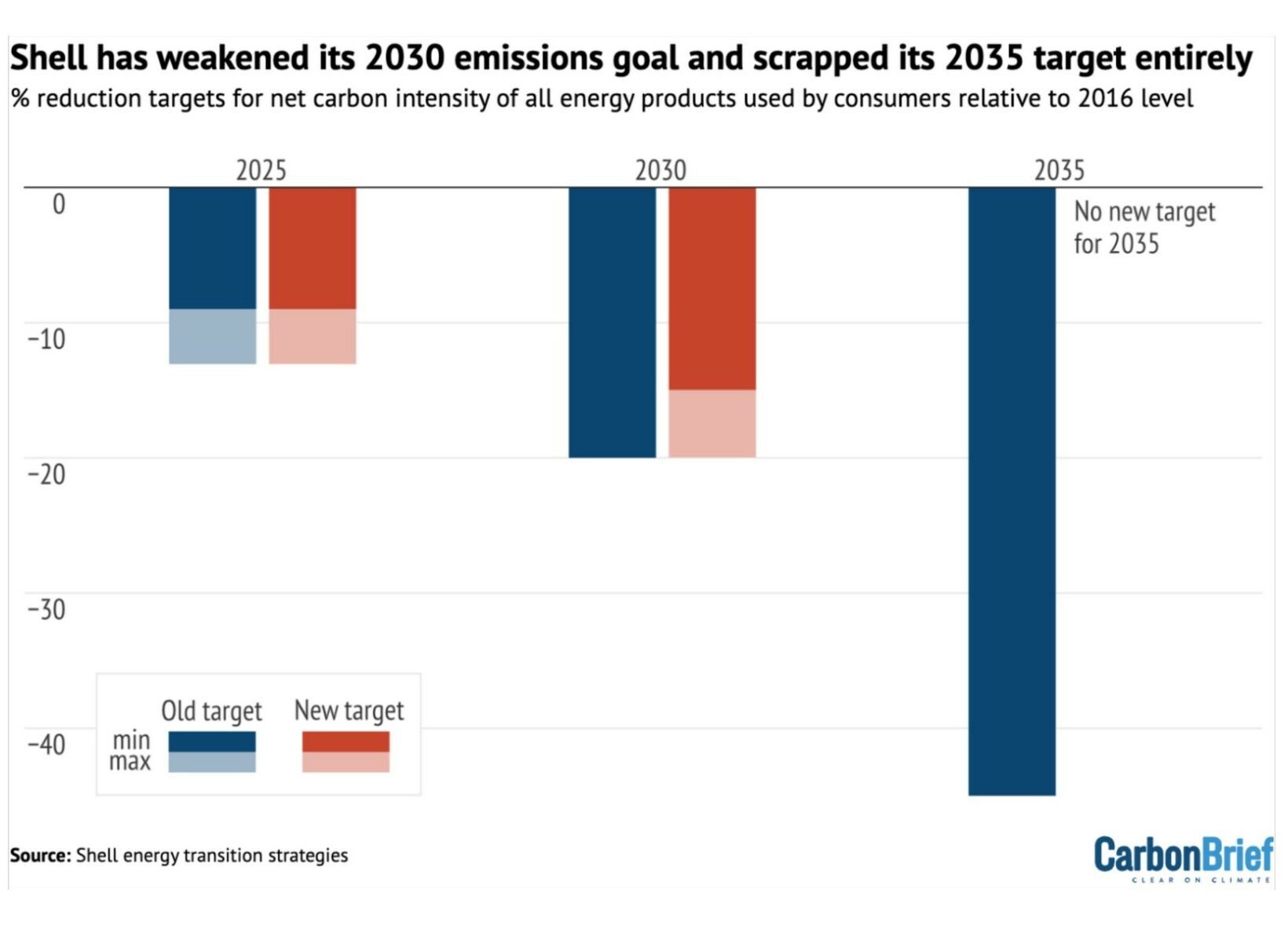 Ainsi, alors que l’objectif initial était d’atteindre 20 % de réduction au minimum de l’intensité carbone entre 2016 et 2030, il n’est désormais plus que de 15 à 20 %. Pire encore, cette baisse devait atteindre 45 % à l’horizon 2035. Finalement, cet objectif précis a disparu du plan de route de Shell.