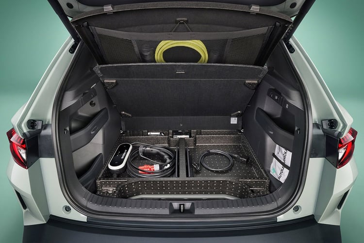 Le SUV propose de nombreux rangements à l’avant et un petit bac amovible au pied de la place centrale arrière, pour un total de 48 litres à bord. Le coffre cube 470 litres (jusqu’à 1 580 litres). C’est autant que dans la malle du Ford Explorer, et entre les 440 litres du Scenic et les 520 litres du e-3008 (tous en mesure VDA). Mais la malle du SUV tchèque se distingue par ses nombreuses solutions pratiques. La tablette, désormais réglable sur deux niveaux, dispose en dessous d’un filet pour pouvoir y loger un câble Mode 3. Utile pour dégager de l’espace sour le plancher d’un seul tenant, et éviter d’avoir à décharger le coffre pour accéder au câble. Mais on y trouve toujours sous cette planche non réglable en hauteur un compartiment pour y ranger d’autres affaires. Enfin, le coffre utilise intelligemment les creux derrière les passages de roue pour y loger deux étagères. Les possibilités d’utilisation sont telles qu’a été placé dans le coffre un QR Code menant à des tutoriels en vidéo. Dommage, la plateforme technique MEB ne permet toujours pas l’installation d’un coffre sous le capot.
