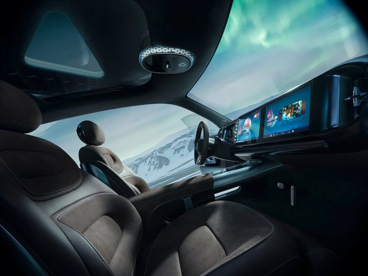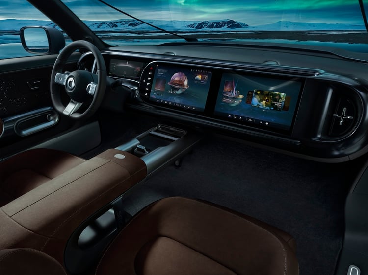 L’intérieur fait la part belle aux écrans. En plus de celui de l’instrumentation, derrière le volant, il y en a deux grands côte à côte sur la planche de bord, dont un face au passager. Une intelligence artificielle permet de piloter des fonctions et de converser avec la voiture. En bon concept, ce véhicule se contente de quatre places avec fauteuils individuels. On a aussi des portes antagonistes sans pied milieu, ce que l’on ne retrouvera pas en série.