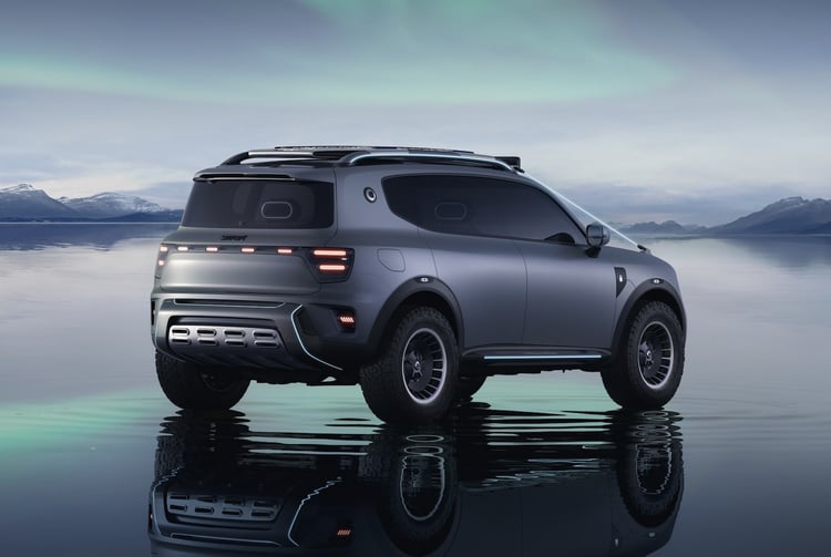 Le côté imposant est renforcé par la silhouette cubique, avec capot haut et plat ou hayon bien droit. Il est aussi renforcé par l’accastillage très aventurier de ce concept, qui reçoit des pneus épais ou une rampe lumineuse en haut du pare-brise. A l’avant, la plaque de protection cache un treuil. A l’arrière, un marchepied permet d’accéder plus facilement au toit. Il suffit de gommer ces artifices pour avoir les lignes de la version de série.