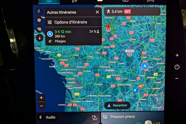 Sur notre ligne de départ, le planificateur d’itinéraire Google nous promet un seul arrêt recharge, avec une arrivée devant la borne avec 21 % de charge restante. Audacieux, puisque le système se baserait alors sur une consommation autoroutière de « seulement » 23,5 kWh/100 km. Dans la réalité, nous avons effectivement pu atteindre cette station de recharge après une première étape de 300 km, mais avec 11 % de charge restante.