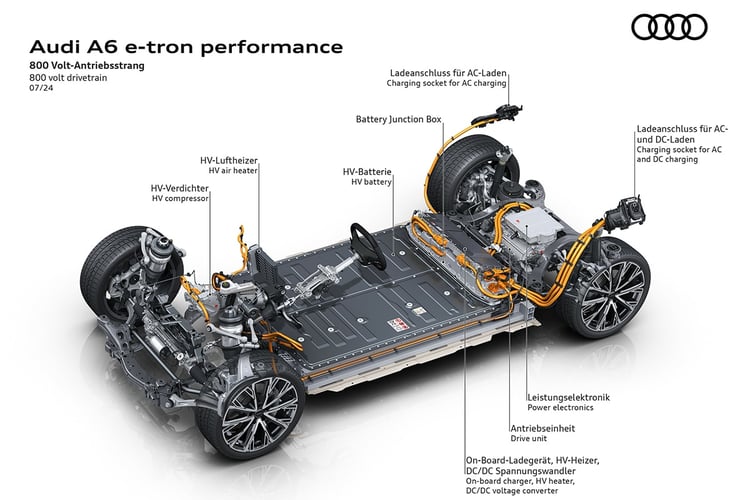 À l’instar des autres modèles basés sur la plateforme PPE, l’architecture est dite 800 V. Mais elle affiche réellement une tension de 662 V avec ses 180 cellules prismatiques branchées selon le principe 180s1p. Comme l’Audi Q6 e-tron quattro que nous avons déjà eu l’occasion d’étudier, la batterie peut aller chercher un pic de 270 kW sur les bornes de recharge compatibles.