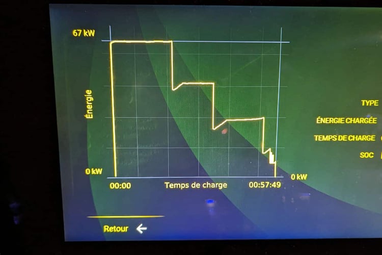 Au final, il faut compter 36 minutes dans le monde réel pour passer de 10 à 80 % de charge, ce qui se traduit par une puissance moyenne à la borne de 60 kW. Micro-citadines mises à part, c’est l’une des plus faibles valeurs que nous avons enregistrées depuis la création de la rubrique. En revanche, avec 64 et 65 kW respectivement, les BYD Atto3 ou Kia Niro EV ne font pas terriblement mieux. La fin de la recharge, utile pour un véhicule à l’autonomie limitée, est juste dans la moyenne : il faut compter 10 minutes de plus pour atteindre les 90 % et encore 15 minutes de plus pour faire le plein à fond. Le 10-100 % est donc réalisé en 1 h 01.