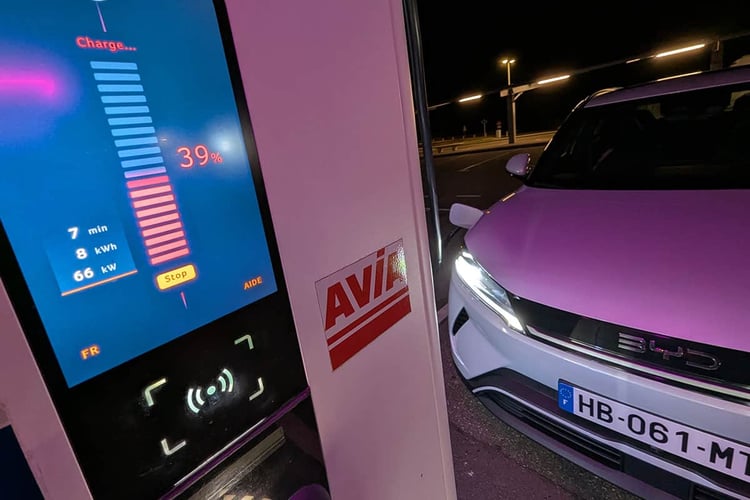 Lors de notre trajet type exclusivement autoroutier de 500 km, nous avons mesuré une consommation moyenne de 22,9 kWh/100 km, soit 186 km d’autonomie totale théorique. Sur cette base, le BYD Atto2 est capable de récupérer 60 km d’autonomie en 15 minutes et 110 km en une demi-heure. Au bout de 45 minutes, il pourra assurer 145 km sur autoroute. C’est peu.