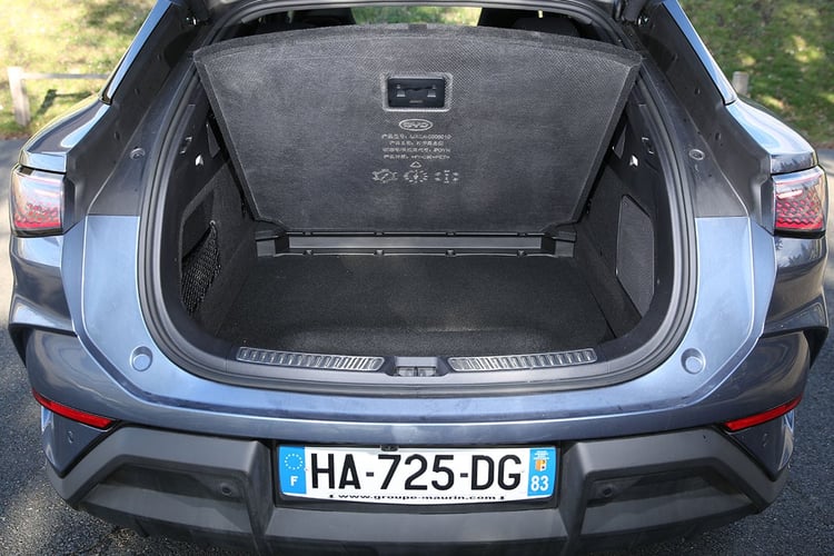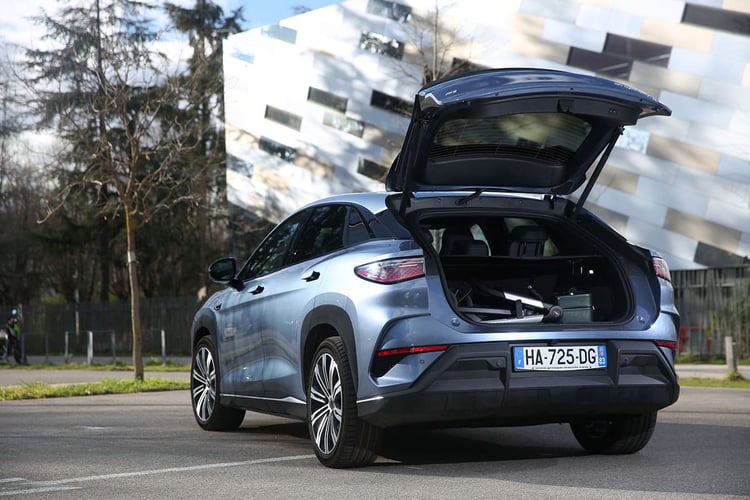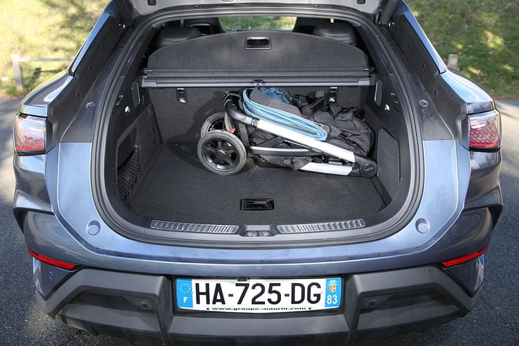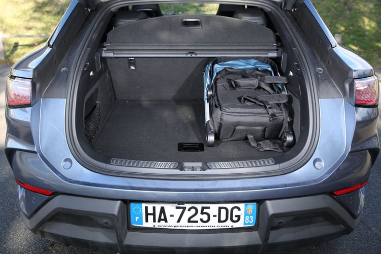 Annoncé à un volume de 520 l, le coffre souffre de la comparaison par rapport à d’autres SUV électriques de cette catégorie. La faute ici à un volume de chargement sacrifié sur l’autel du style. Ce qui n’empêche pas de pouvoir partir en famille en logeant des objets plutôt volumineux. Notre poussette Thule Spring peut trouver sa place en long ou en large. D’un volume de 58 l, le compartiment avant peut accueillir un câble de recharge et quelques accessoires.