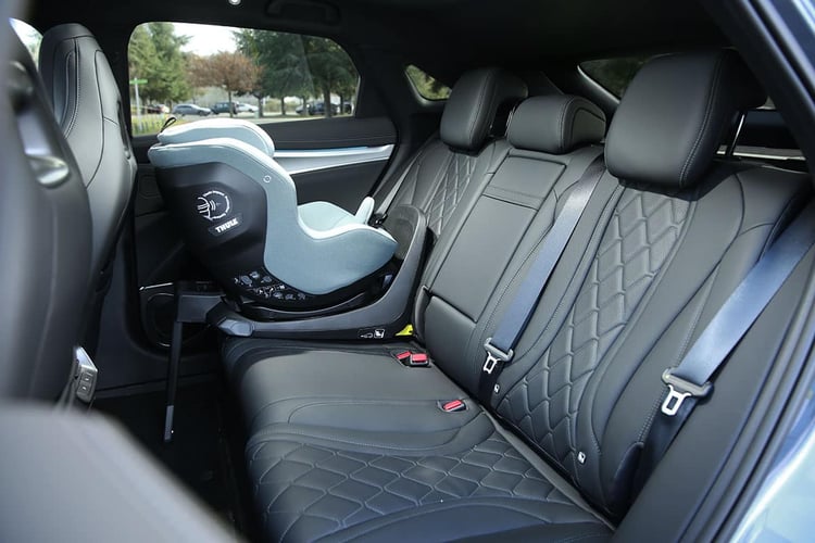 Avec un empattement de 2,93 m, le SUV fait très logiquement la part belle à l’habitabilité arrière. Le rayon aux genoux est royal, et la garde au toit, quoique réduite en raison du pavillon fuyant, n’est pas handicapante. Le siège avant et les deux places latérales arrière sont équipées de griffes ISOFIX. Si elles sont difficiles d’accès à l’arrière, notre base 360° Thule Alfi et son siège Elm trouvent parfaitement leur place. Le large encadrement des portes permet d’installer facilement un enfant à bord et le siège passager peut rester à sa place.