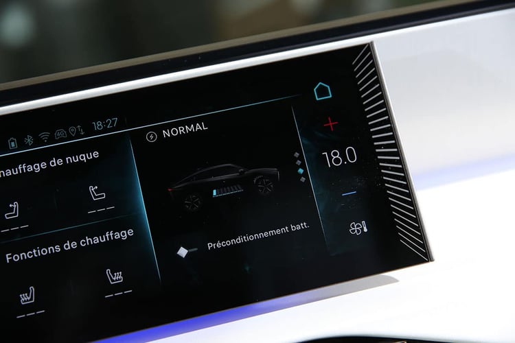D’après nos mesures, le dispositif réclame 45 minutes de fonctionnement pour porter la batterie à la température cible définie par le système avant une recharge rapide. C’est tout aussi lent que celui d’une Renault 5 e-Tech. D’après le compteur de consommation, un cycle complet dans ces conditions consomme 2,4 kWh selon le compteur interne. Le système de préconditionnement de la DS Numéro 8 se situe dans la moyenne de nos observations. Sur la route, avec une batterie un peu plus chaude donc, il faut compter une demi heure. Un temps plus proche des standards.