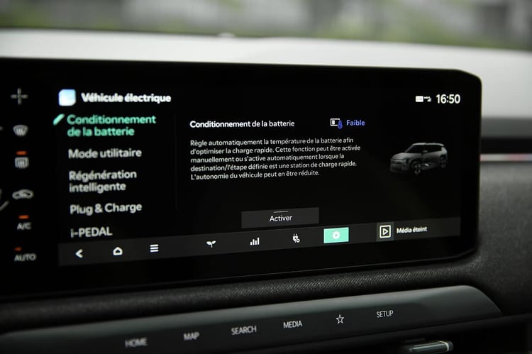 Le Kia EV3 est équipé d’office d’un système de préconditionnement couplé à la navigation, ou à activer manuellement. Pour mieux aider le conducteur à faire un choix dans ce dernier cas, le système indique la condition thermique de la batterie selon trois niveaux (faible, adaptée ou élevée). D’après nos mesures, la batterie ne serait plus considérée comme froide avec une température supérieure à 25 °C. Lors de notre essai, nous n’avons pas rencontré de conditions météo hivernales au sens propre. Mais nous avons pu réaliser des mesures à froid, avec une batterie à 10 °C. Pour rappel, il s’agit d’une température que la batterie peut avoir même en hiver.