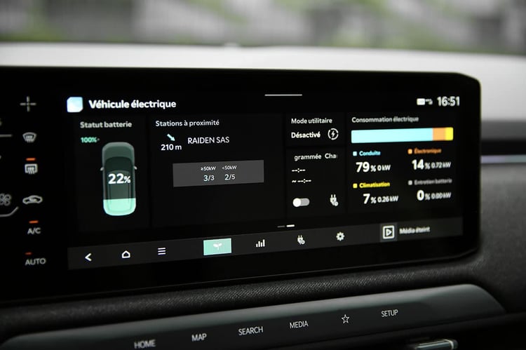 Sur notre parcours type exclusivement autoroutier de 500 km, nous avons mesuré une autonomie totale théorique de 342 km pour le Kia EV3 Long Range. Rapporté à sa courbe de recharge, cela se traduit par un gain de 127 km en 15 minutes, puis de 233 km en 30 minutes. Équivalent à un Scenic e-Tech (124 km/15 min) le temps d’un café, le Coréen prend le large au bout d’une demi-heure et se place au niveau des meilleures routières comme la BYD Seal (228 km/30 min) ou la Mercedes EQE (244 km/30 min.) par exemple.