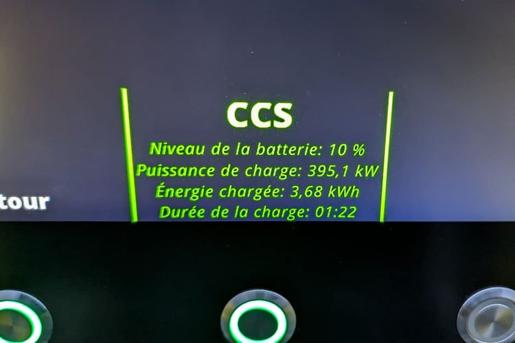 En revanche, il ne semble pas s’agir d’un souci d’incompatibilité entre le système de la voiture et de la borne. Sur une troisième borne identique, nous avons noté une courbe de recharge encore plus intéressante que celle enregistrée sur la borne de 400 kW. Mais nous nous sommes raccordés avec 20 % de charge restante, expliquant sans doute le phénomène : moins sollicitée et potentiellement moins chaude, la batterie a encaissé un peu plus de puissance en fin de charge. Au final, le 20-80 % a été plus court d’une minute qu’avec notre recharge type. Ce qui, avec le temps nécessaire au 10-20 %, porterait le temps de recharge à près de 14 minutes. Mais il ne s’agit que de supposition puisque nous additionnons des intermédiaires. Cela est purement théorique et ne correspond pas à nos méthodes de calcul.