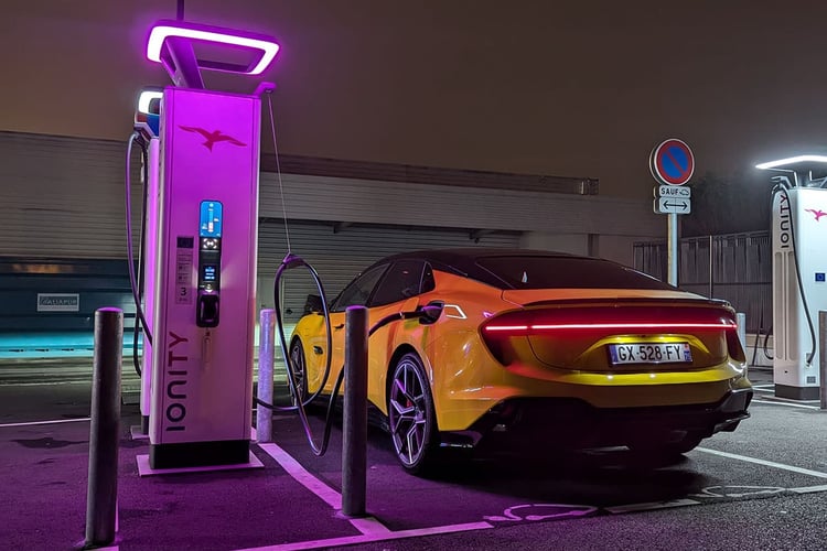 Malgré sa consommation importante sur autoroute et une autonomie de 360 km, la Lotus Emeya 600 fait des voyages une vraie formalité grâce à ses performances de recharge. Problème : elle ne pourra pas toujours rencontrer des bornes capables de délivrer la pleine puissance. Et ce, même s’il existe quelques unités de 400 kW installée entre Paris et Lyon. Mais celles-ci ne sont pas sur toutes les aires, et réservées aux poids lourds (pas de blague sur les 2 555 kg de l’Emeya s’il vous plaît). Bref, dans notre cas, nous avons dû effectuer la seule pause recharge sur une borne Ionity. Hélas, malgré un roulage de 300 km sur autoroute, l’activation du préconditionnement batterie et un taux de charge de 13 % à l’arrivée, il n’a jamais été possible d’atteindre les 350 kW promis par la borne (voir courbe en début d’article). Dès lors, nous avons dû patienter 15 minutes avant de débrancher la voiture pour passer la ligne d’arrivée avec près de 20 % de charge restante, comme le veut notre protocole de mesure.