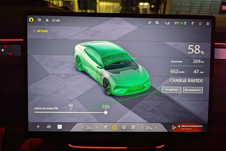 Sur notre parcours autoroutier type de 500 km entre le sud de Lyon et Paris, nous avons enregistré une consommation moyenne de 27,8 kWh/100 km, soit une autonomie totale théorique de 356 km. Sur cette base, la Lotus Emeya 600 est capable de récupérer près de 250 km d’autonomie autoroute en 15 minutes, et près de 320 km en une demi-heure. Seule la Porsche Taycan fait mieux le temps d’un café (320 km en 15 minutes). Au bout de 30 minutes, la Lucid Air parvient à repasser devant grâce à sa consommation mieux maîtrisée (340 km en 30 minutes).